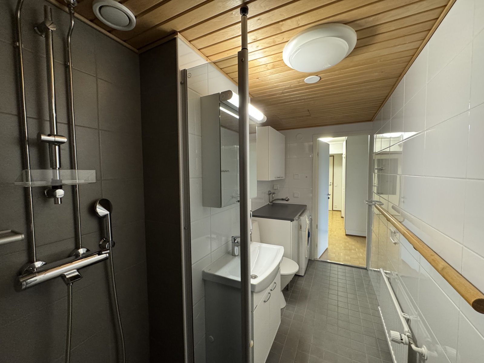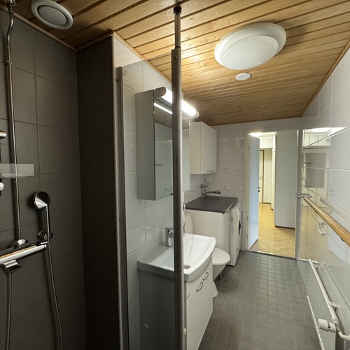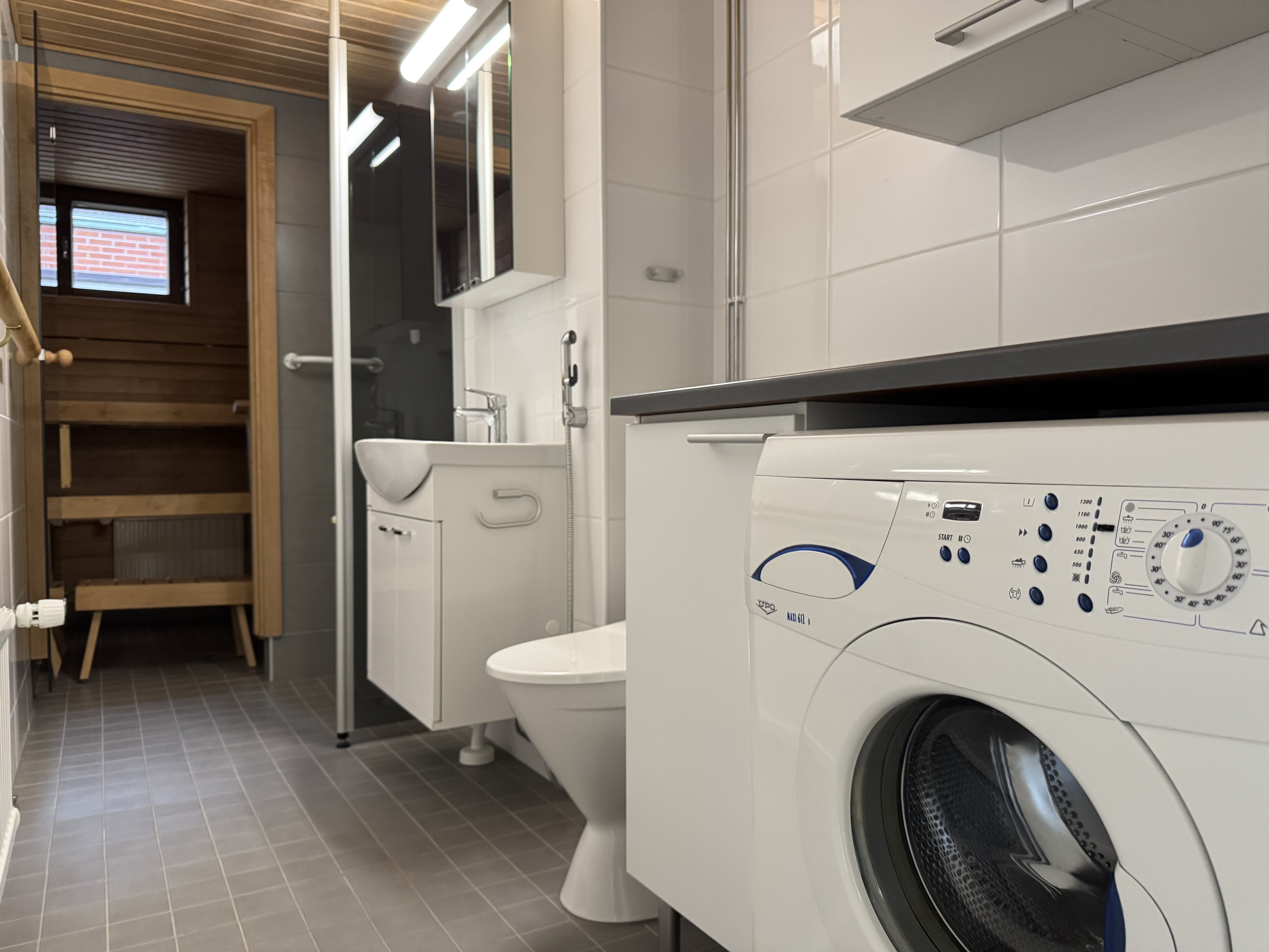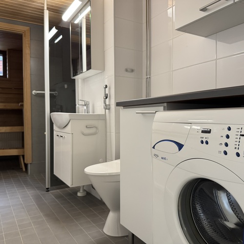 Varusteet: suihkuseinä, pesukone, pesukoneliitäntä, lattialämmitys, wc-istuin, suihku, peilikaappi, kiinteät valaisimet, kylpyhuonekaapisto