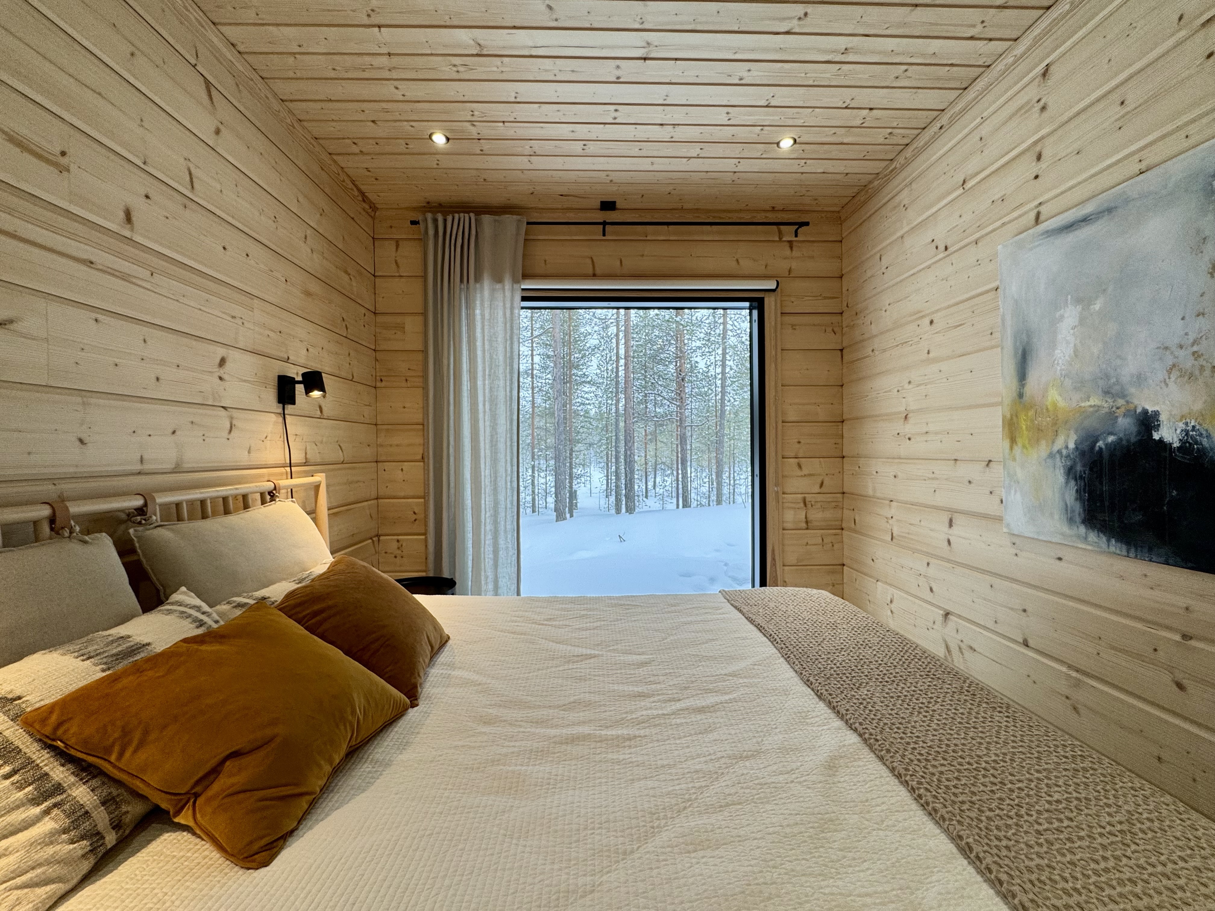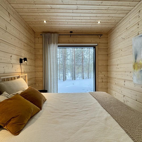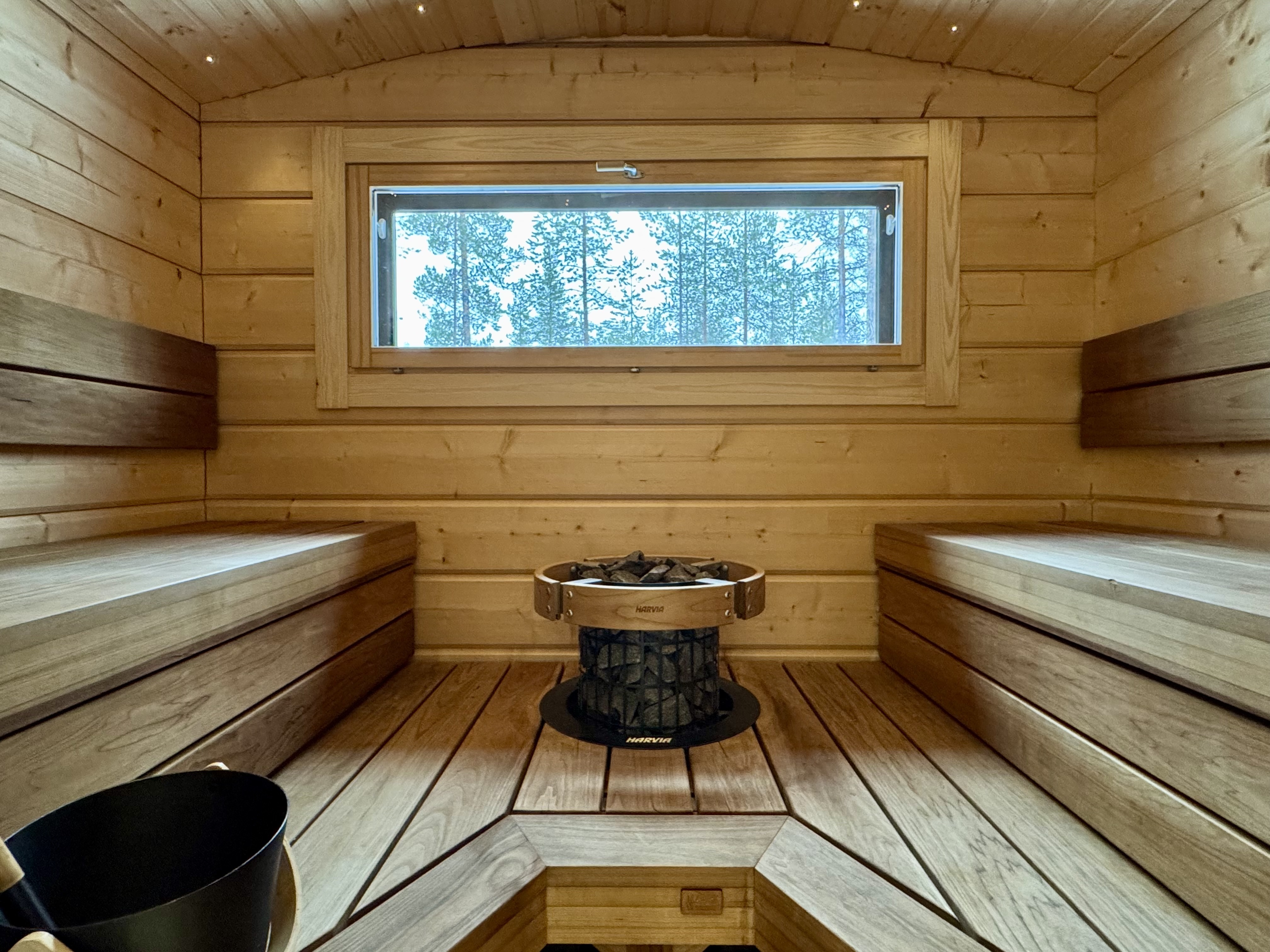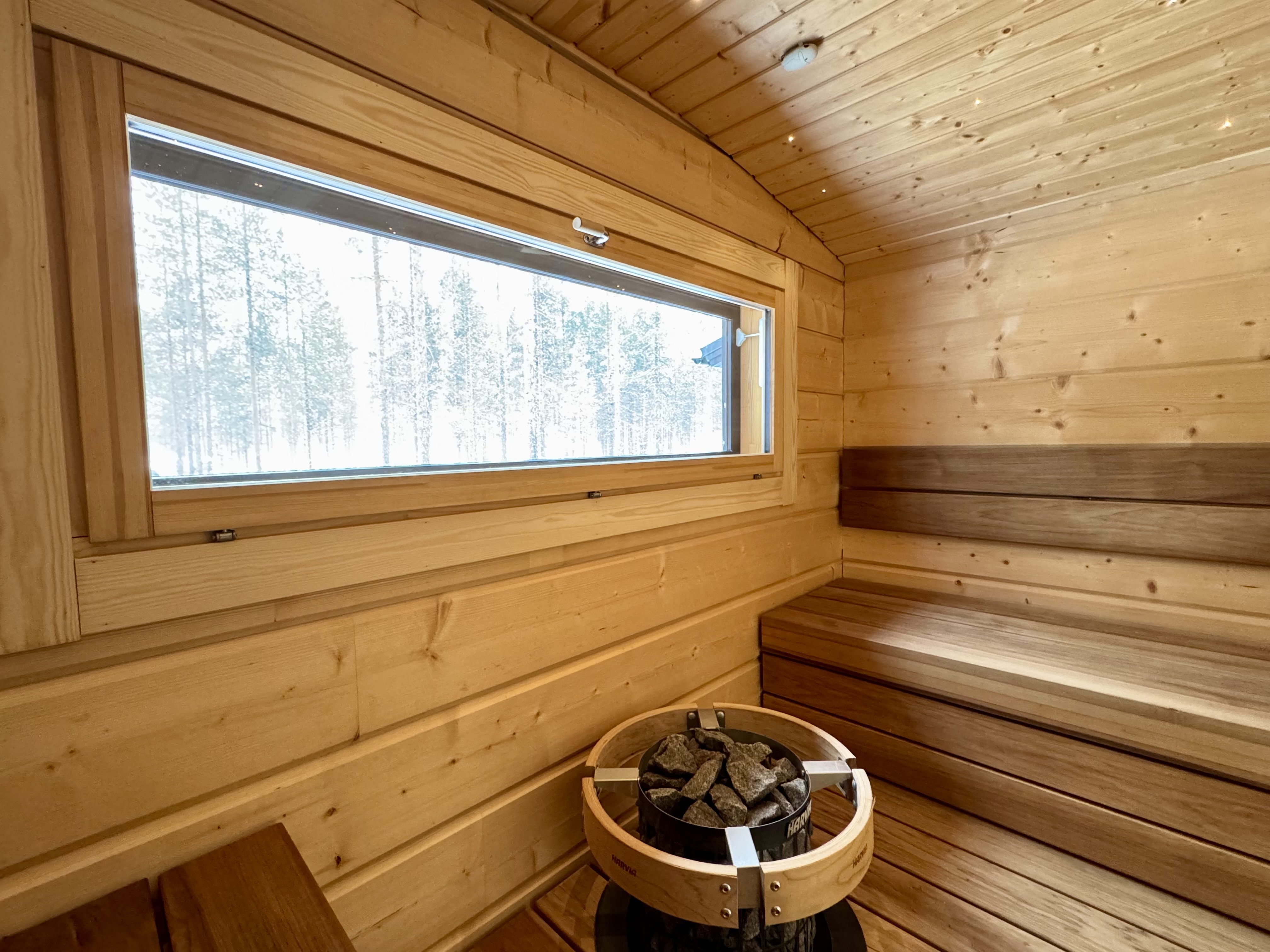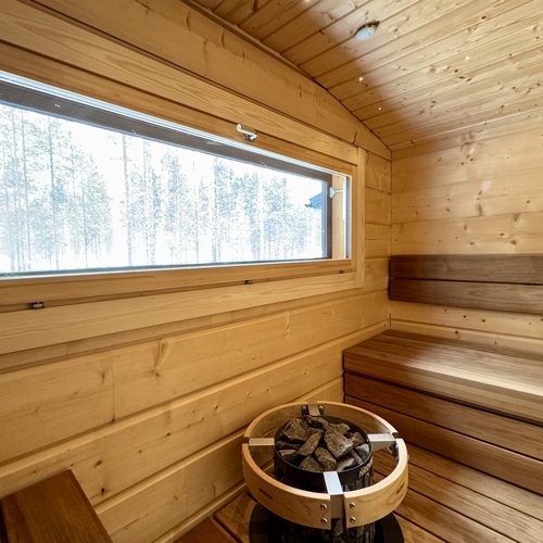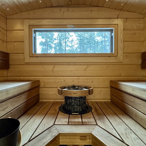 SähkökiuasLumi-sauna, diplomaattilauteet lämpöhaapaa, Harvian Cilindro- pilarikiuas, ikkuna luontoon