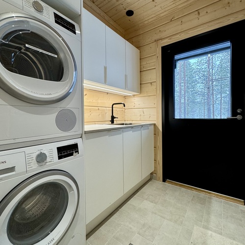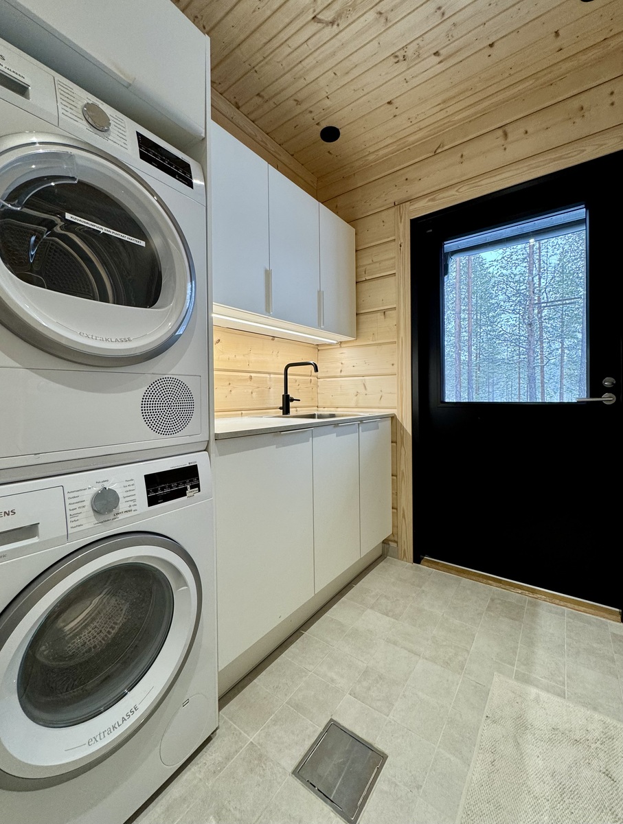 Varusteet: pesukone, kuivausrumpu, pesuallas, lattiakaivo, pyykkikaapit, pöytätaso