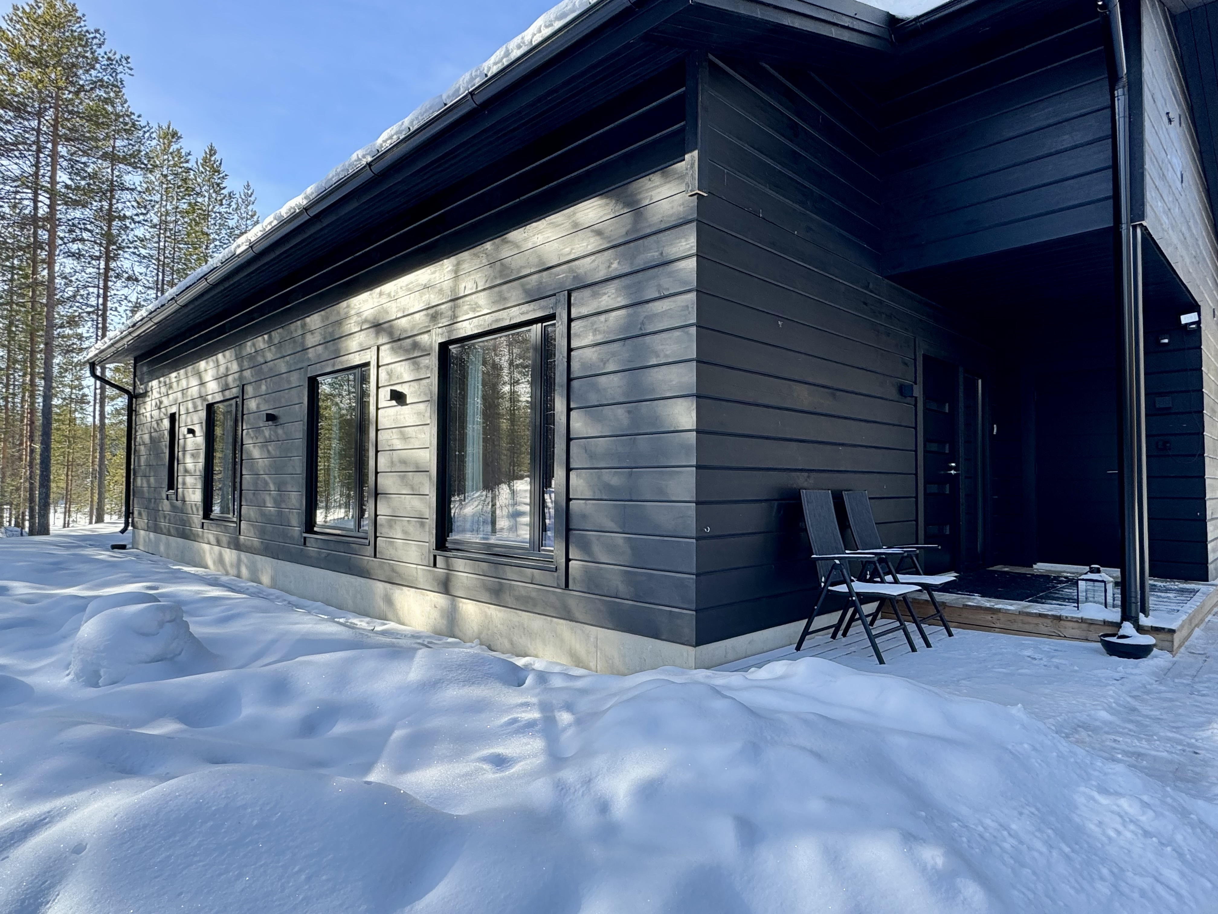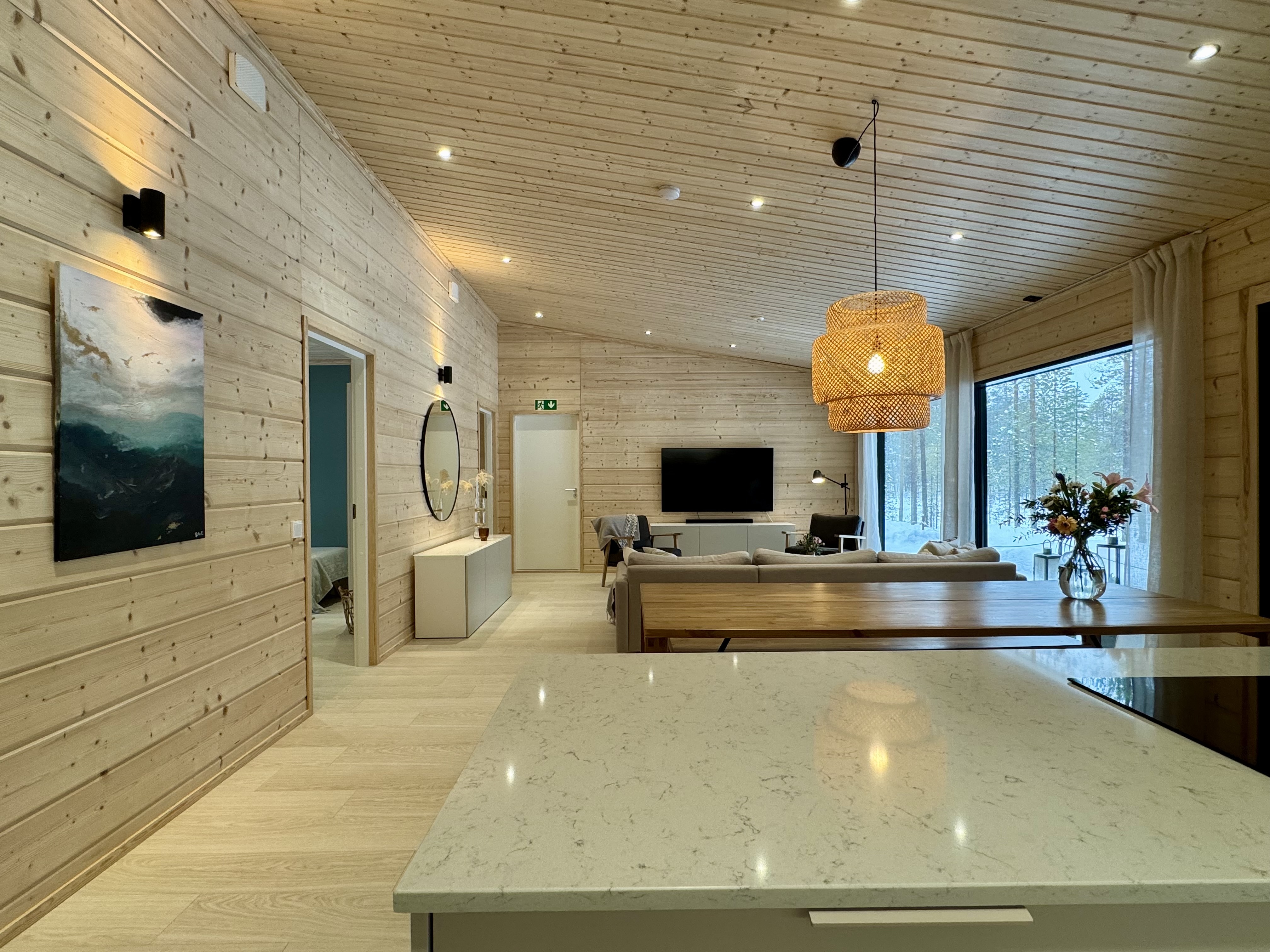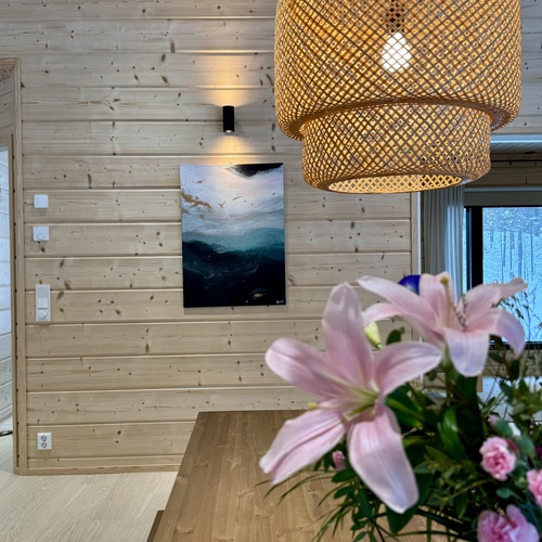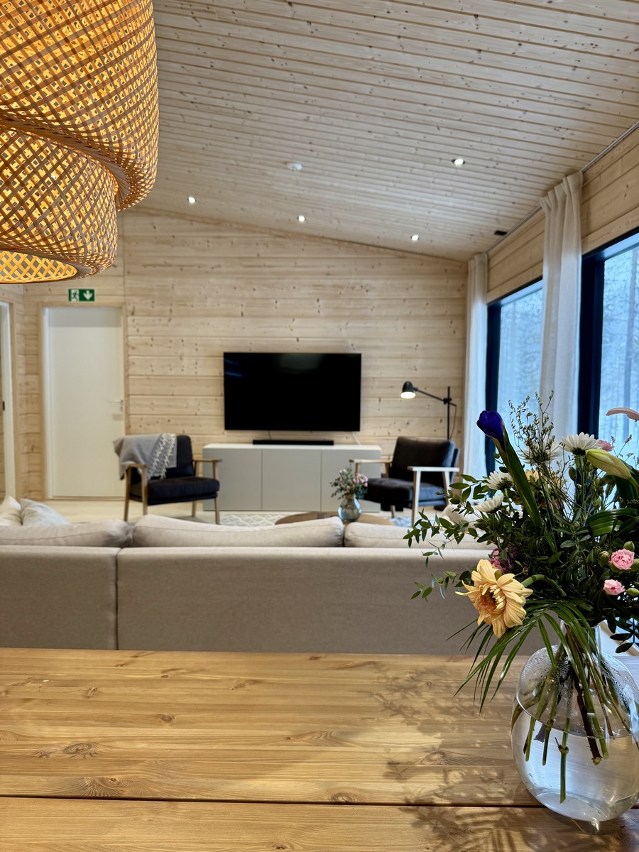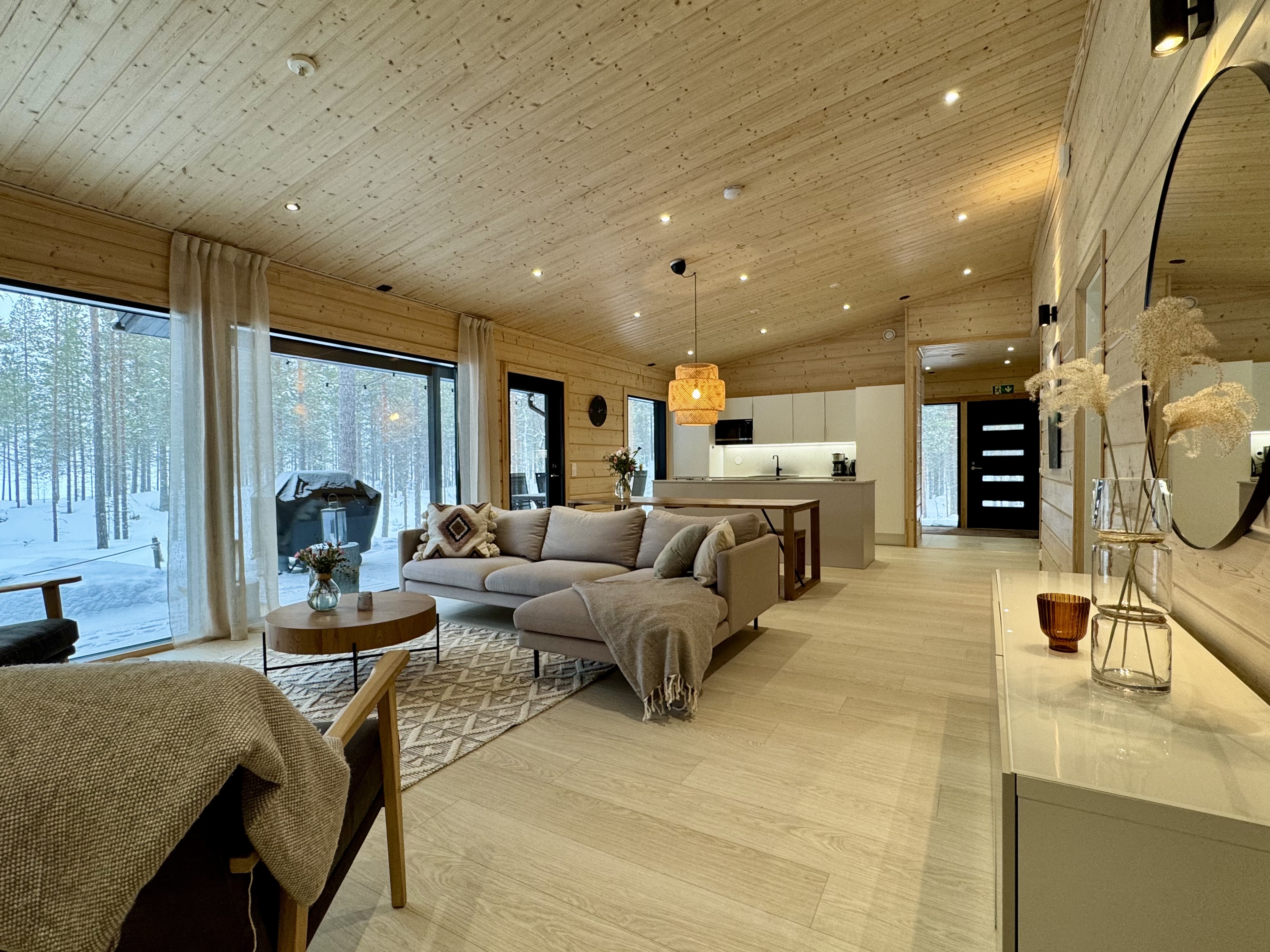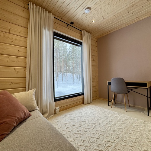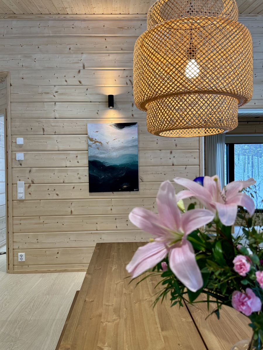 Suurista, lattiaan asti ulottuvista ikkunoista tulvii sisälle eri vuodenaikojen mukaan vaihtuva maisema ja luonnon valo. Kesäisin välkehtii järvi, talvella lumivalkeat hanget. Hillasuotkin ovat aivan lähettyvillä.