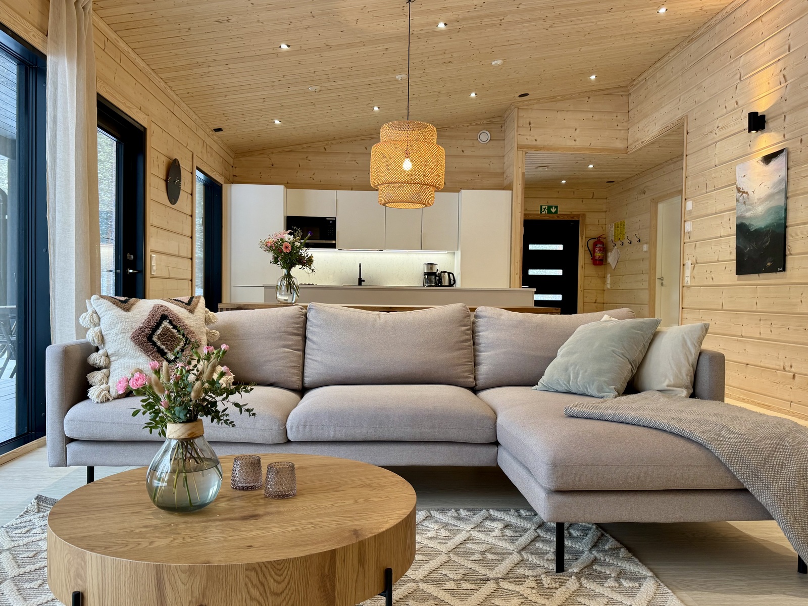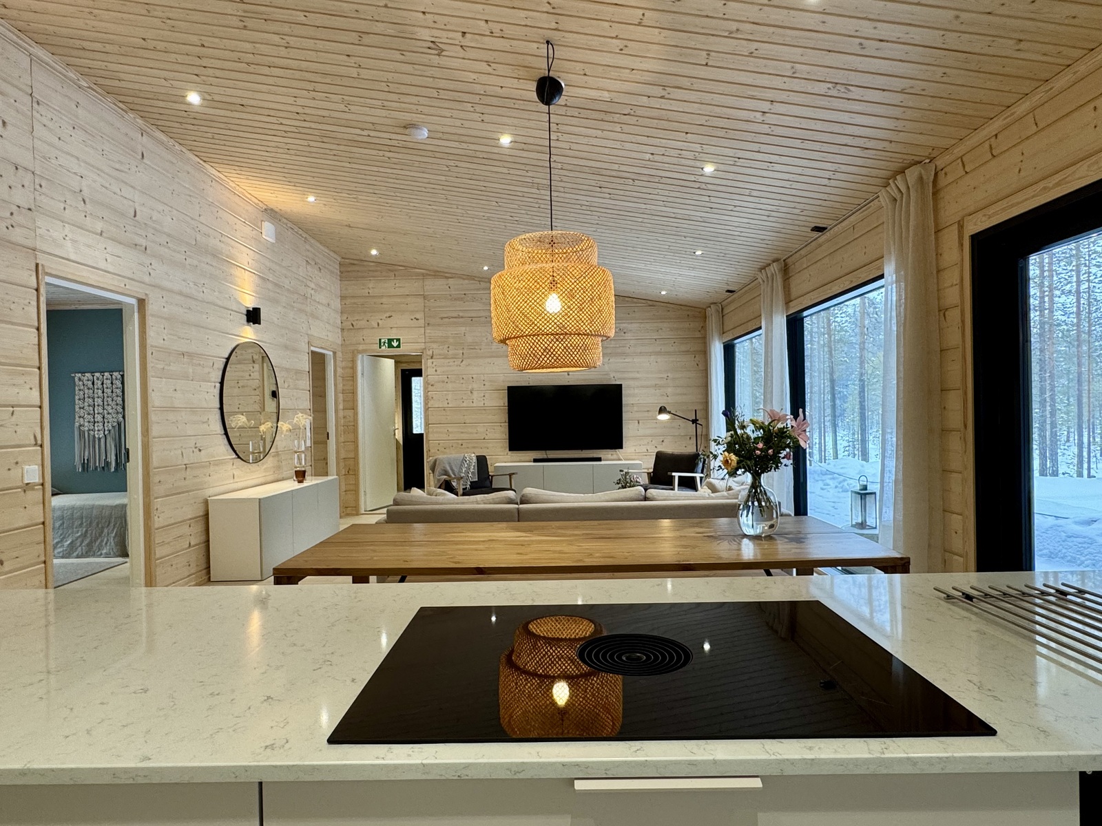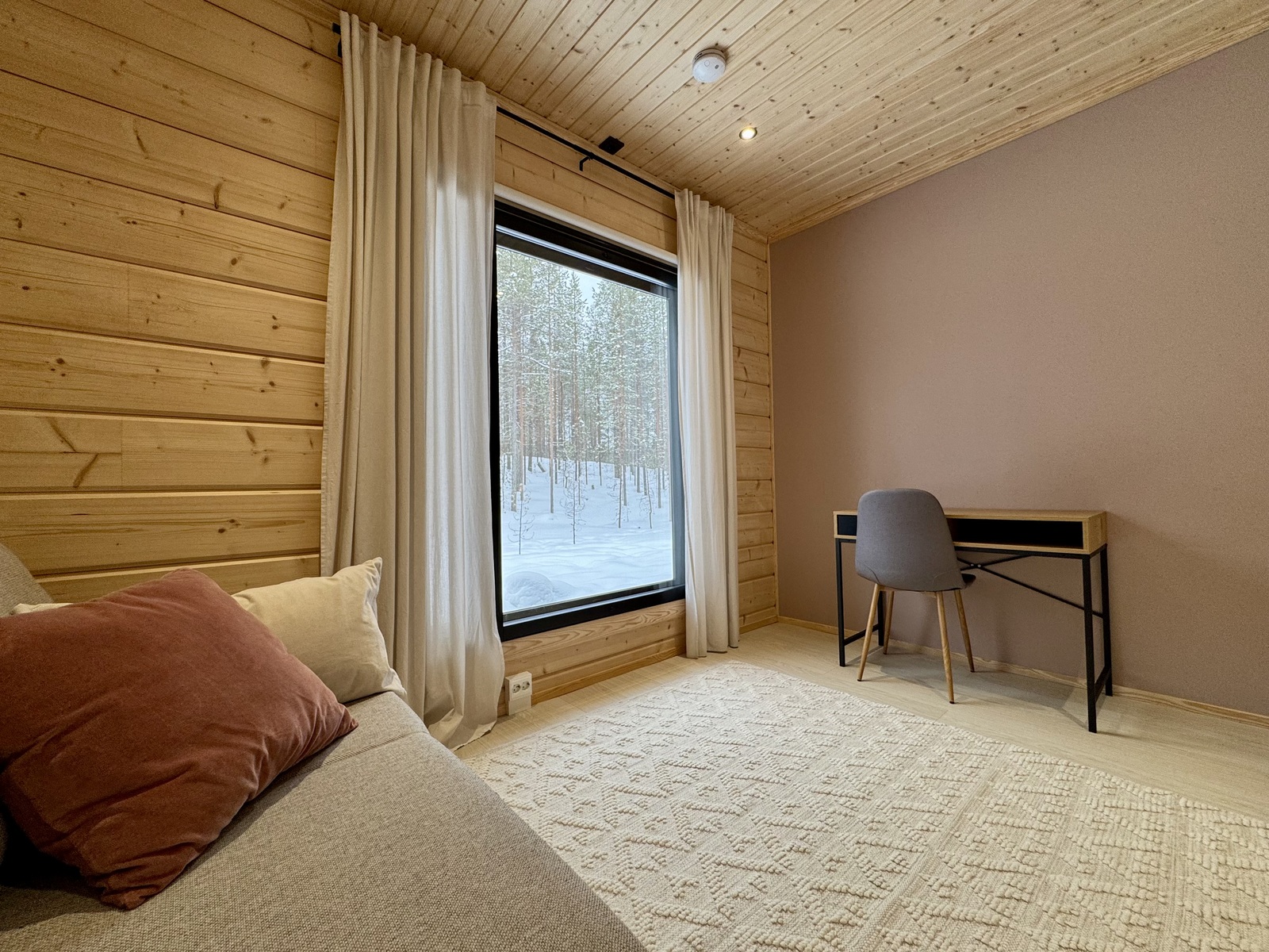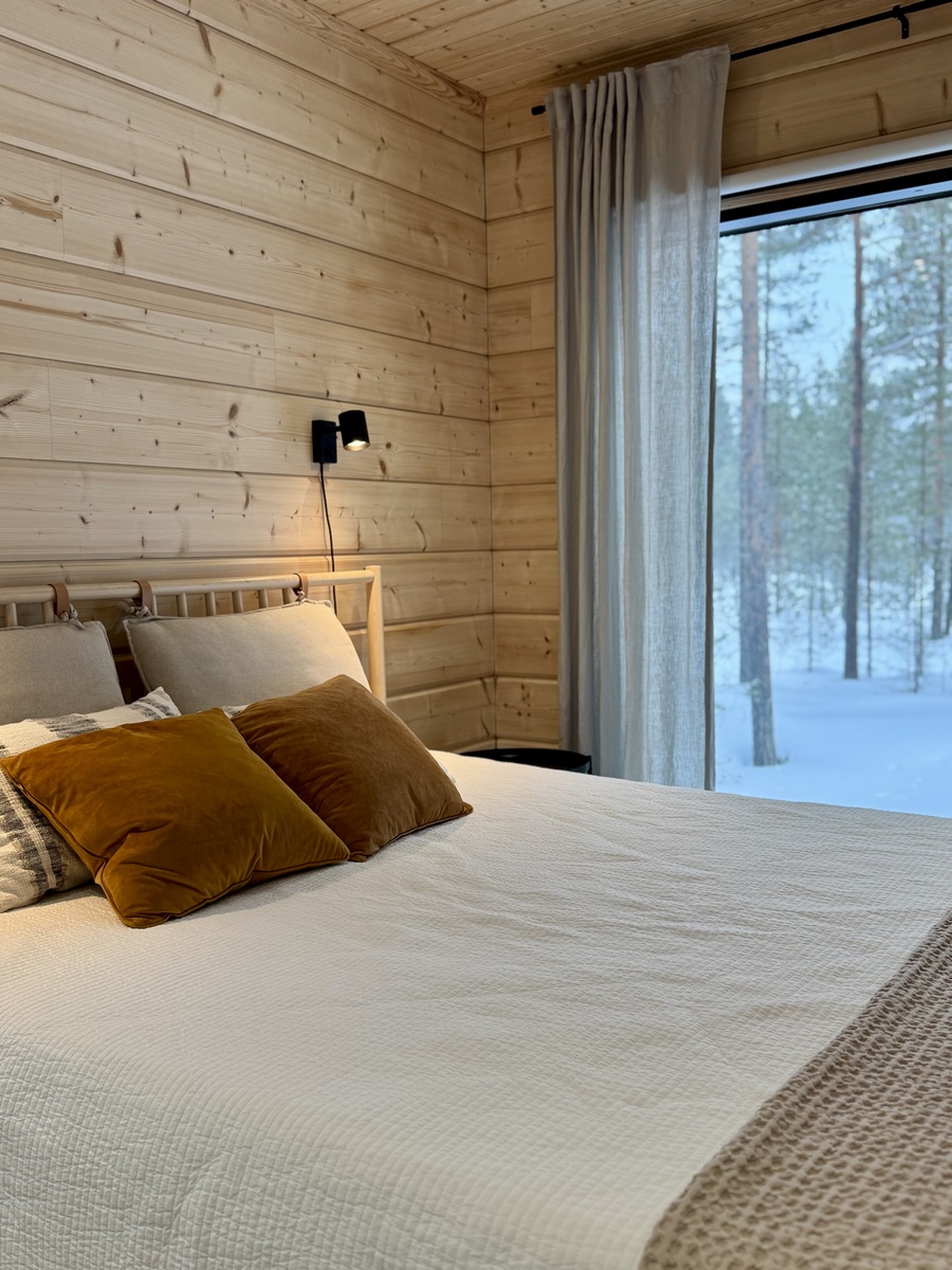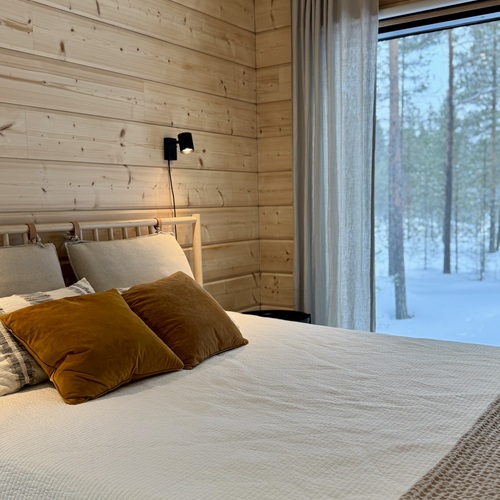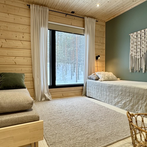 Suurista, lattiaan asti ulottuvista ikkunoista tulvii sisälle eri vuodenaikojen mukaan vaihtuva maisema ja luonnon valo. Kesäisin välkehtii järvi, talvella lumivalkeat hanget. Hillasuotkin ovat aivan lähettyvillä.