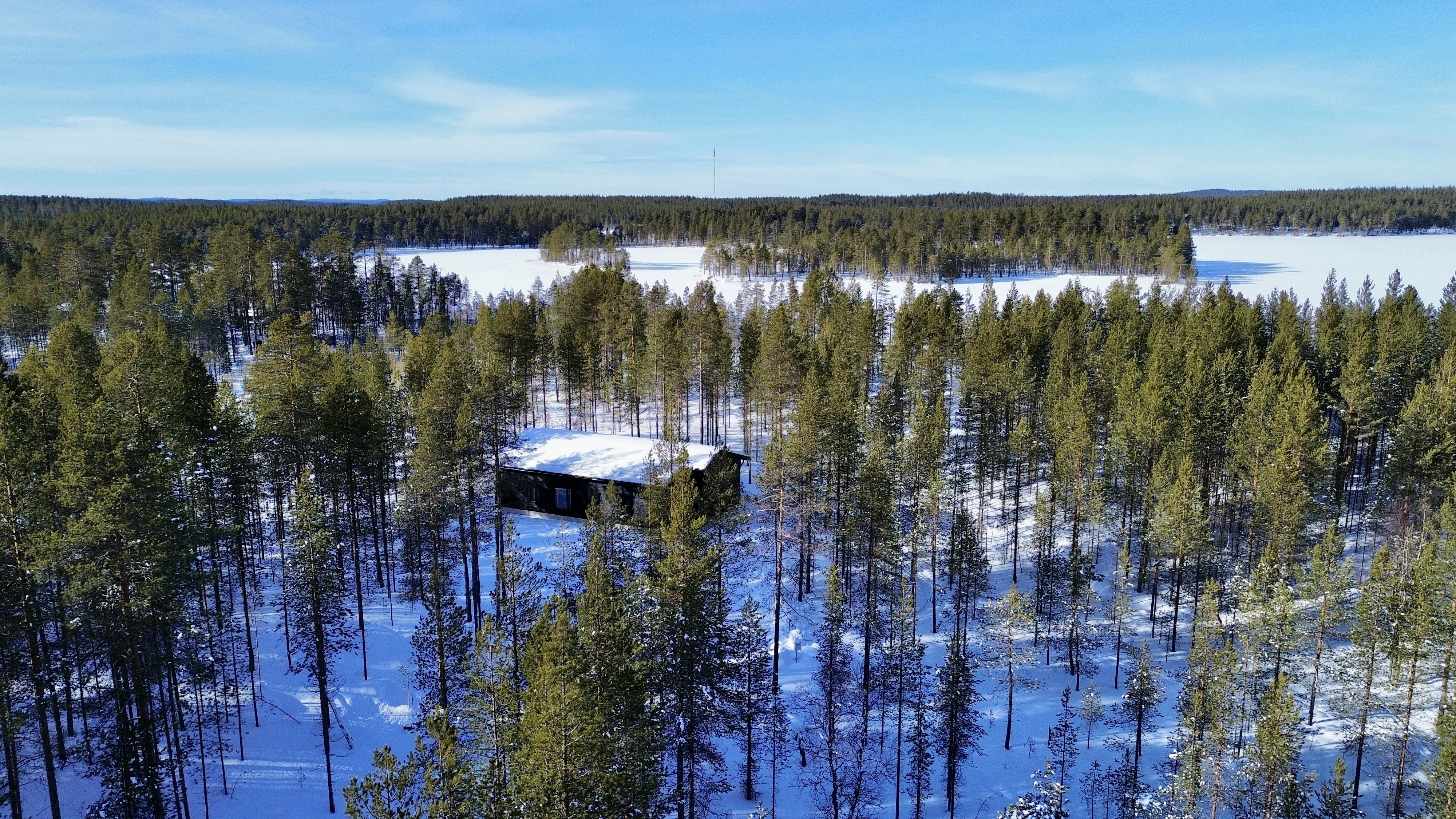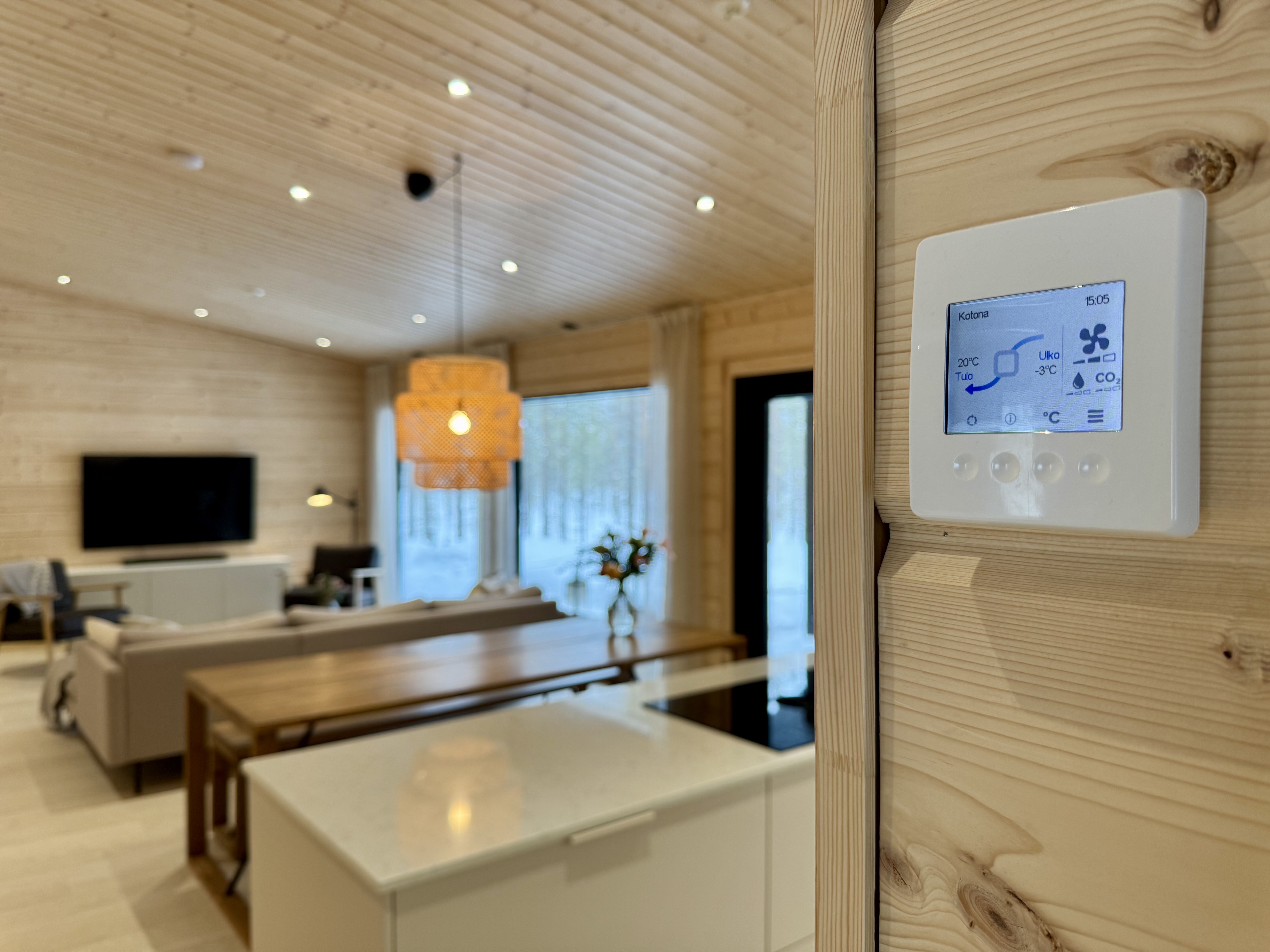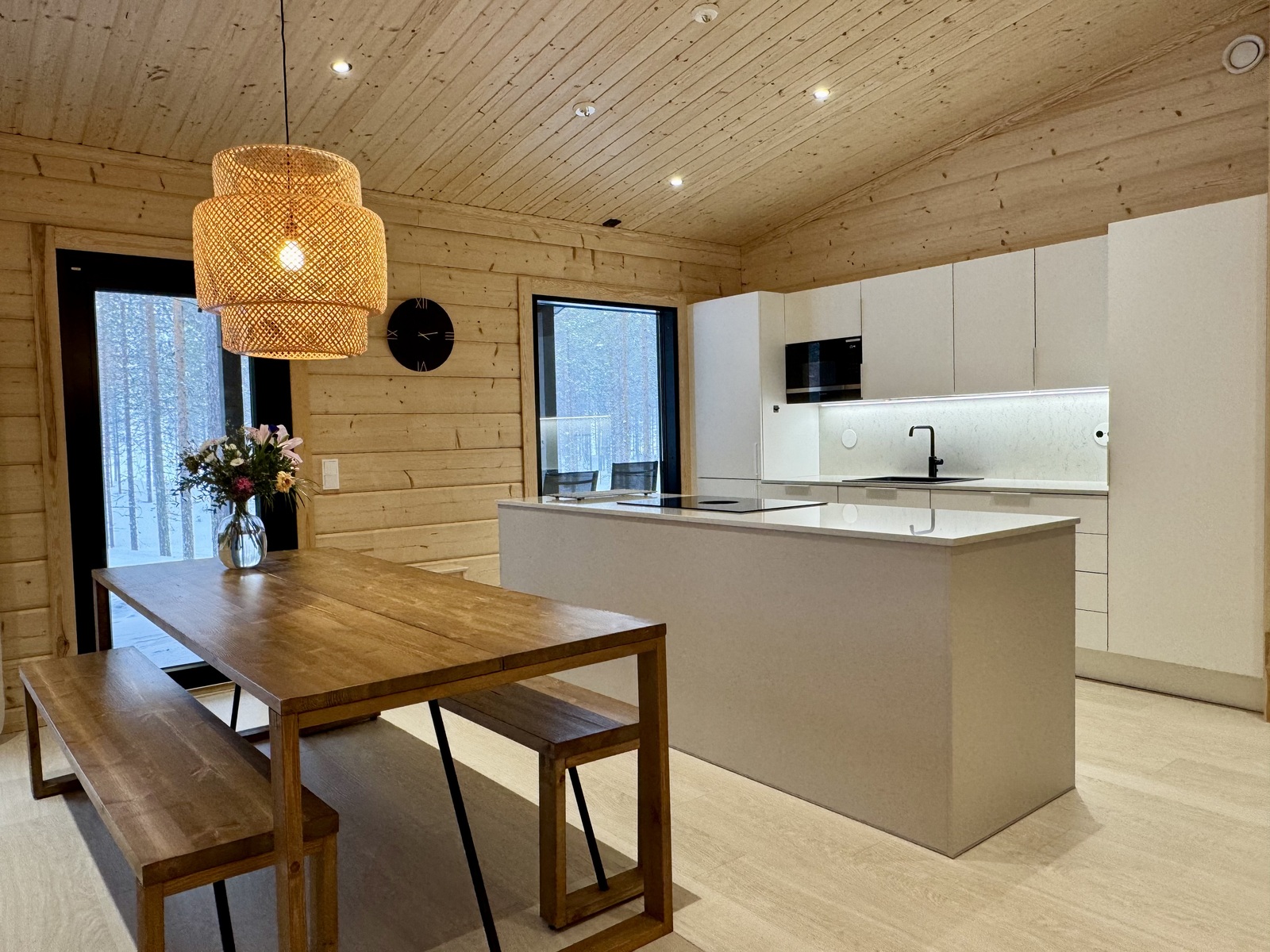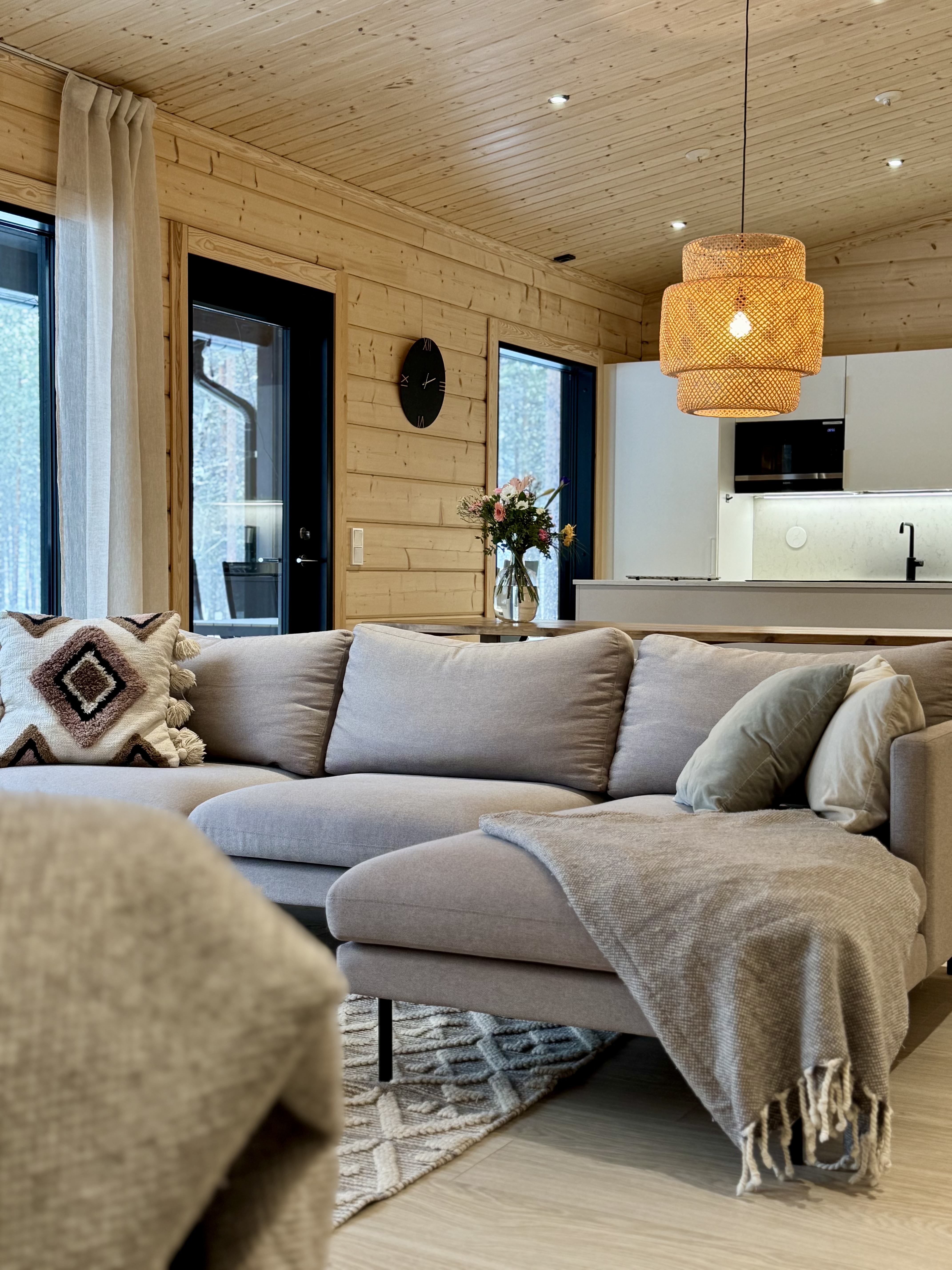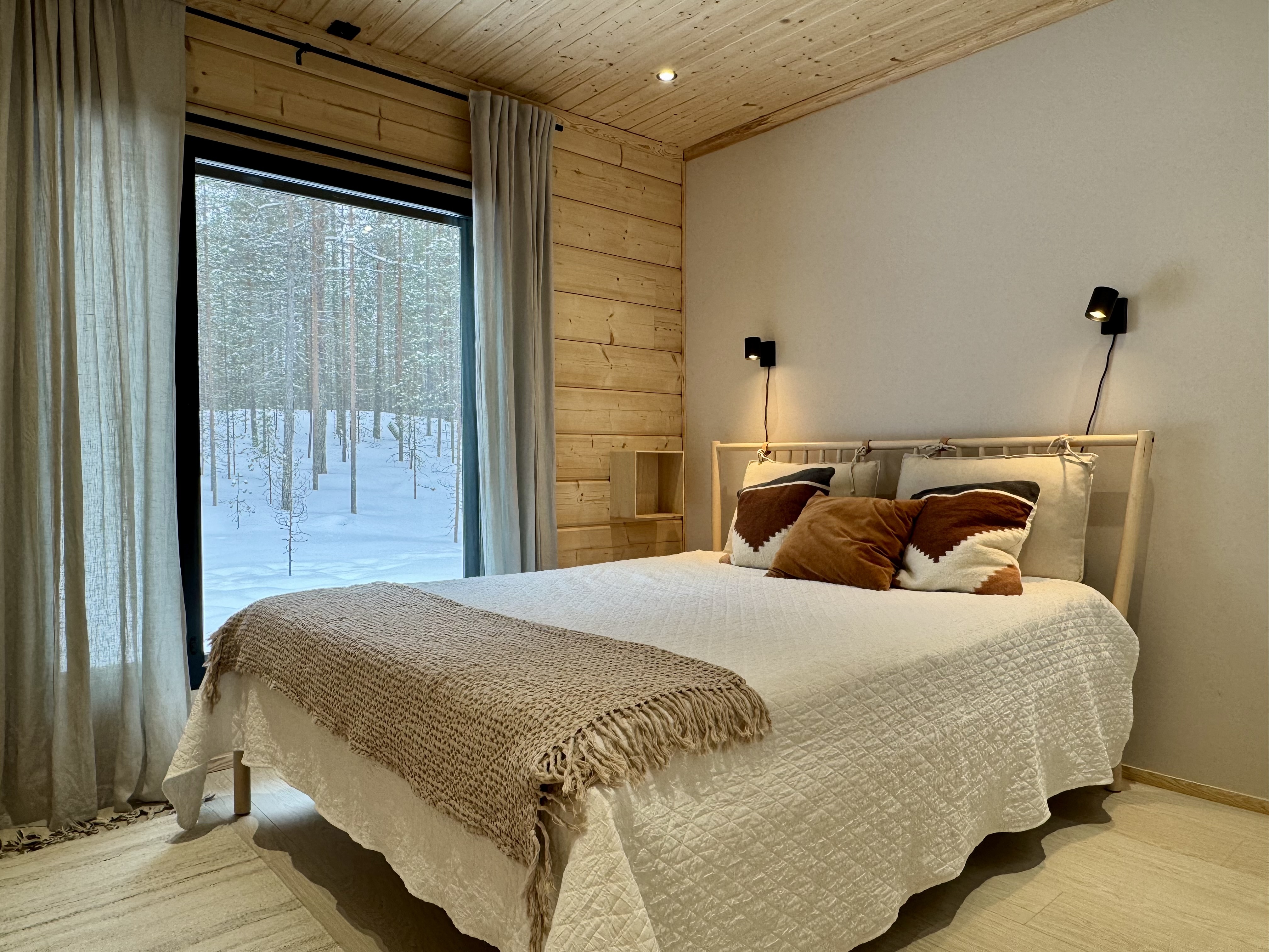 Suurista, lattiaan asti ulottuvista ikkunoista tulvii sisälle eri vuodenaikojen mukaan vaihtuva maisema ja luonnon valo. Kesäisin välkehtii järvi, talvella lumivalkeat hanget. Hillasuotkin ovat aivan lähettyvillä.