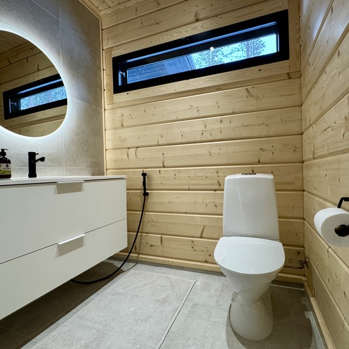 Varusteet: wc-istuin, suihku, peili, kiinteät valaisimet, kylpyhuonekaapisto