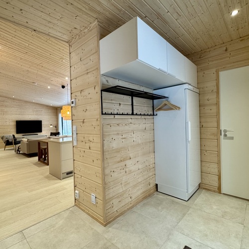 Kodinhoitohuoneessa keskuspölynimuri (BEAM), Pyykinpesukone, kuivausrumpu, uloskäynti terassille.