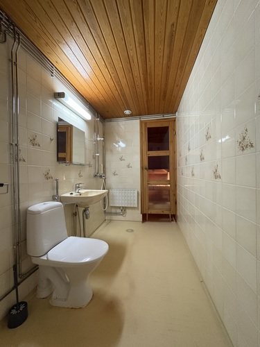 Varusteet: pesukoneliitäntä, wc-istuin, suihku, peili, kiinteät valaisimet