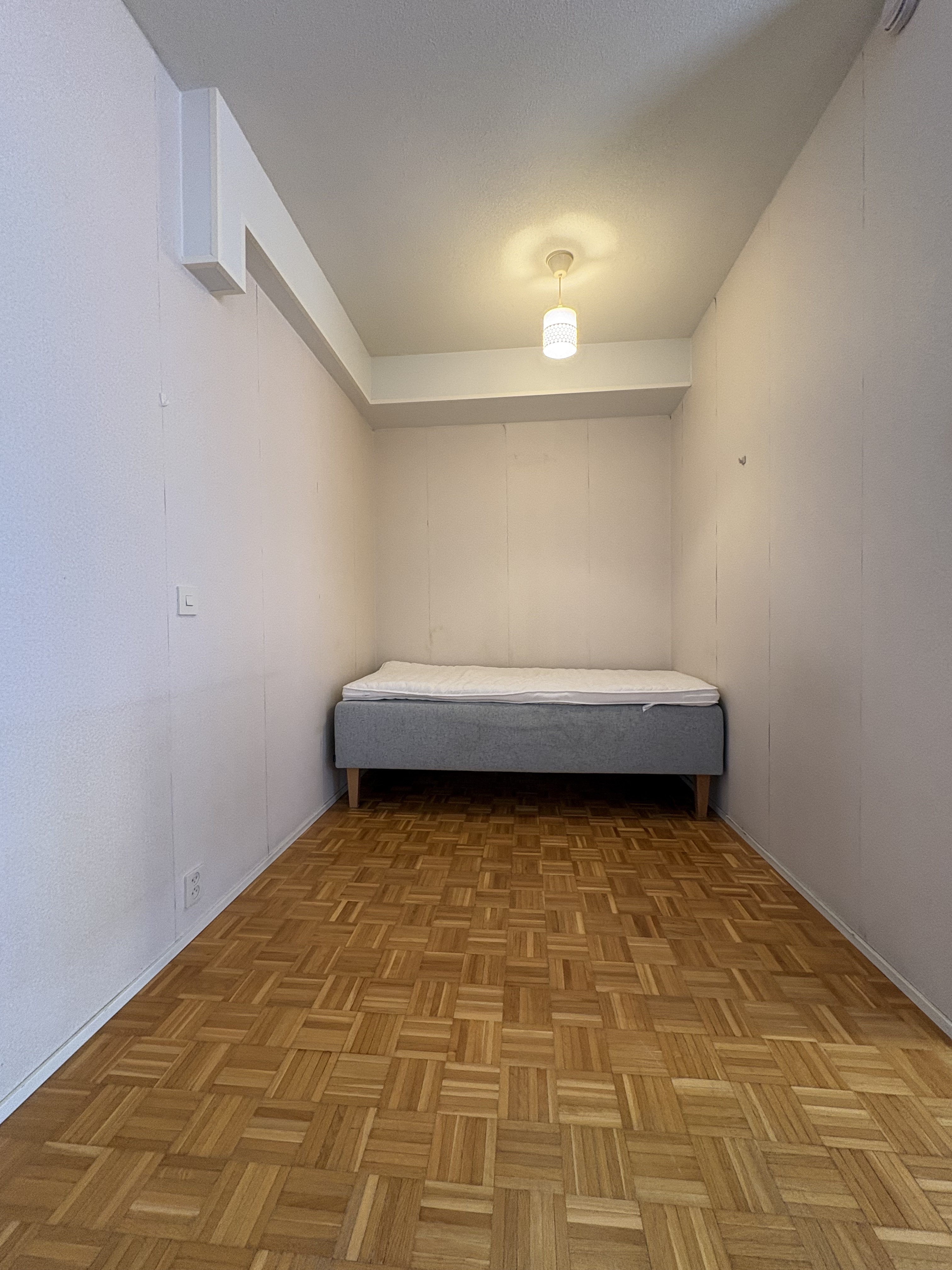 Makuualkovi, jossa tapetti seinät, parketti lattia