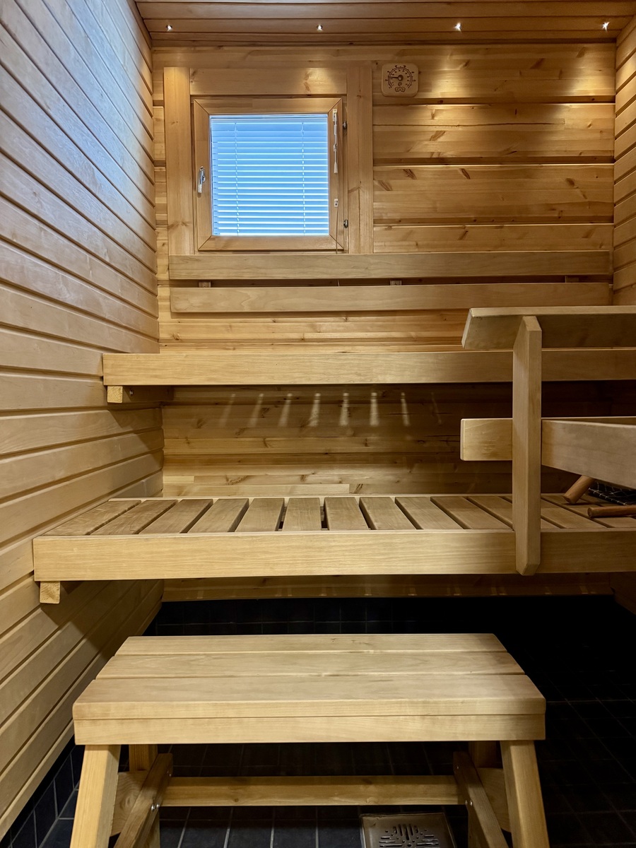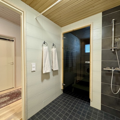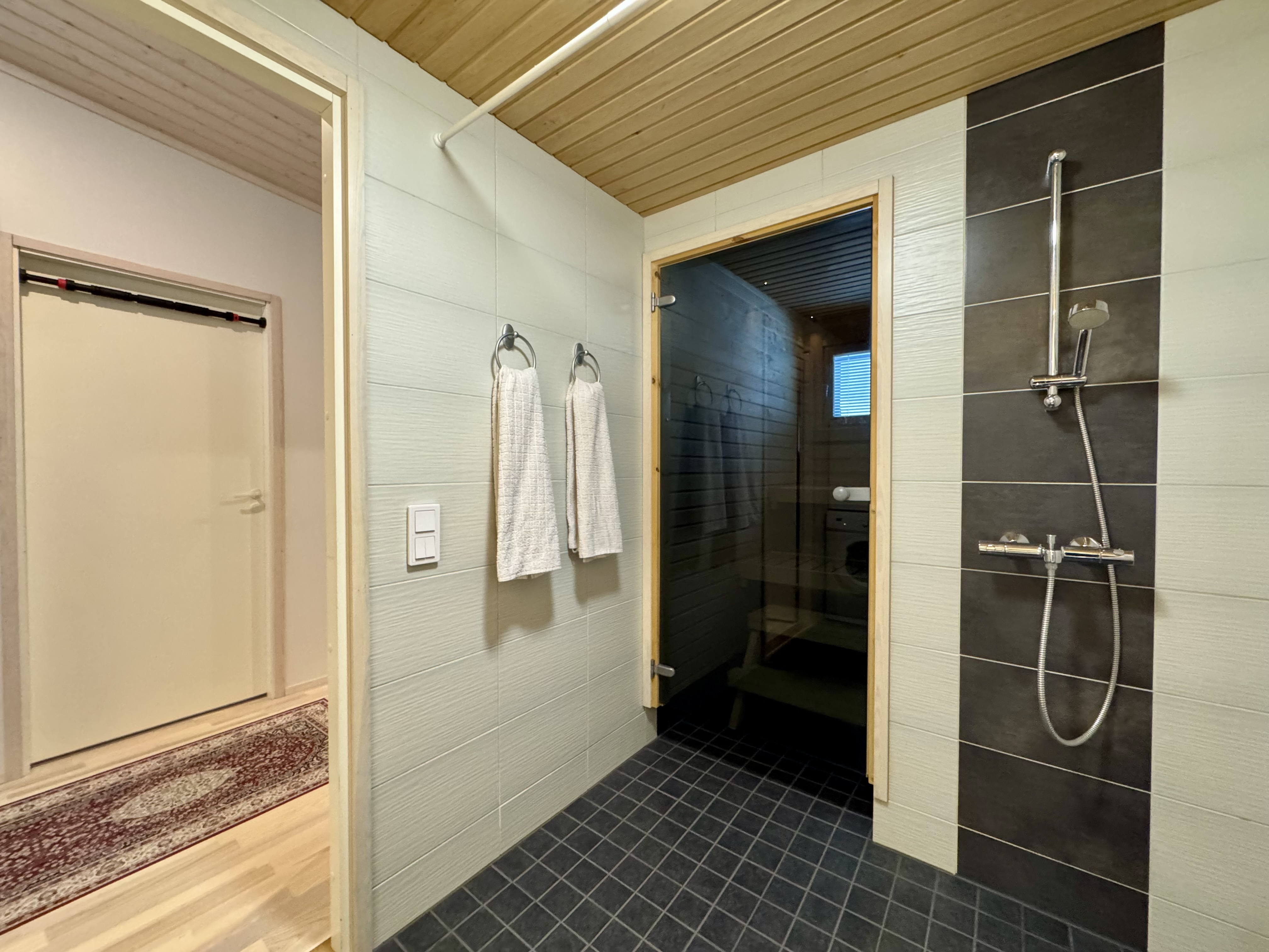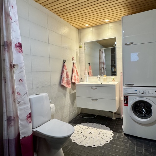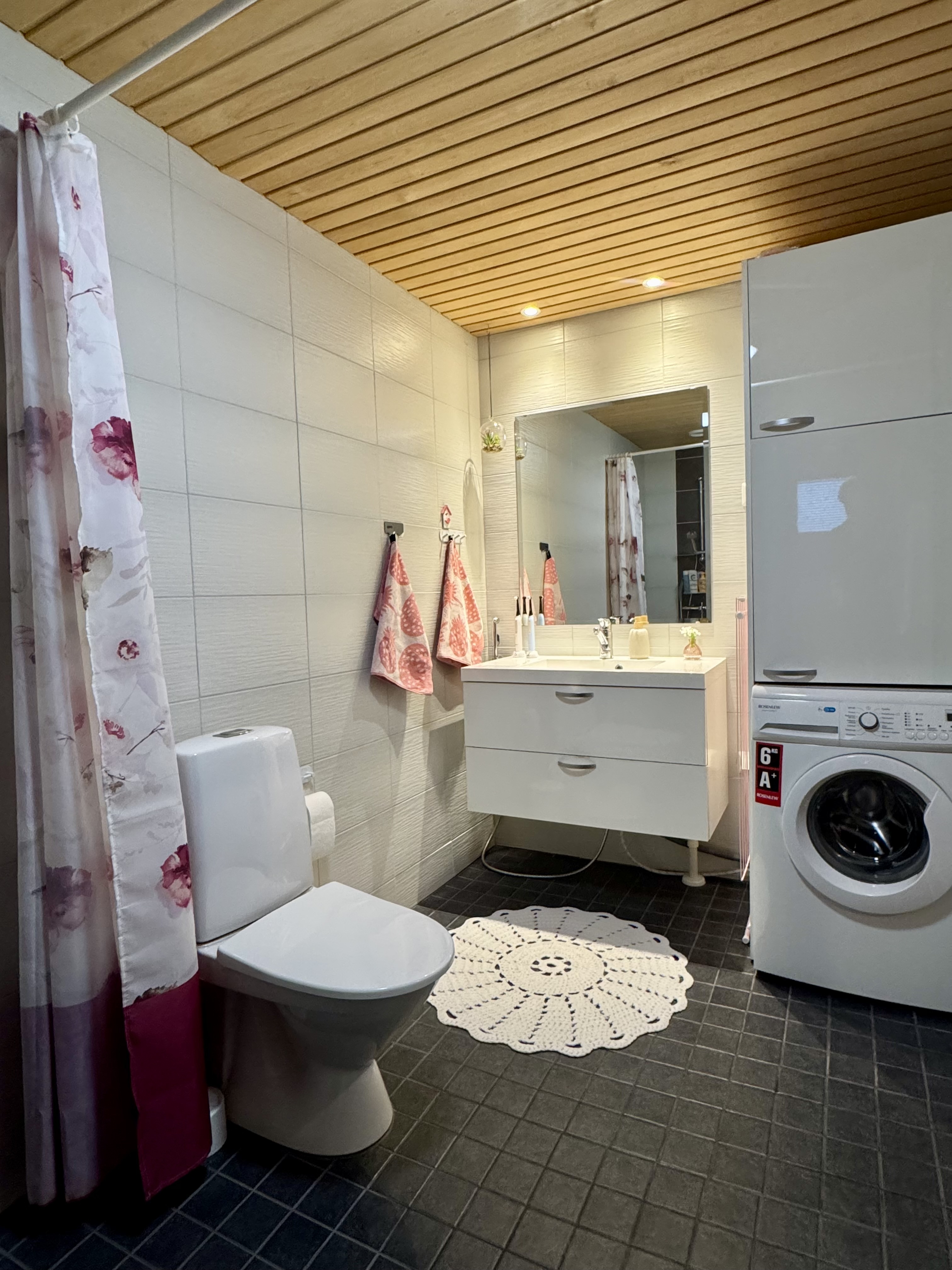Varusteet: pesukoneliitäntä, lattialämmitys, suihku, peili, kiinteät valaisimet, kylpyhuonekaapisto