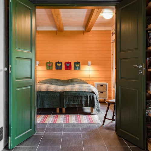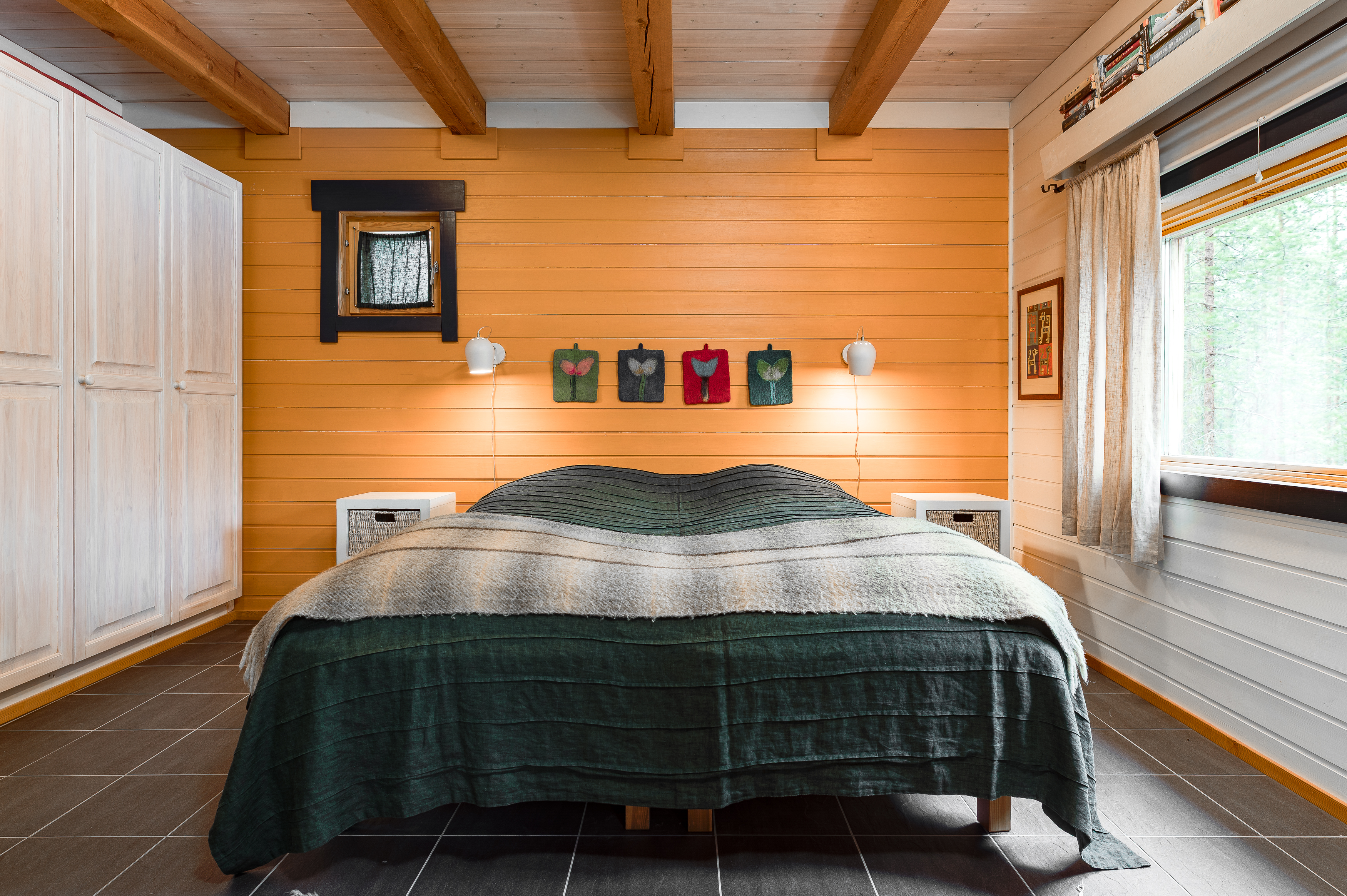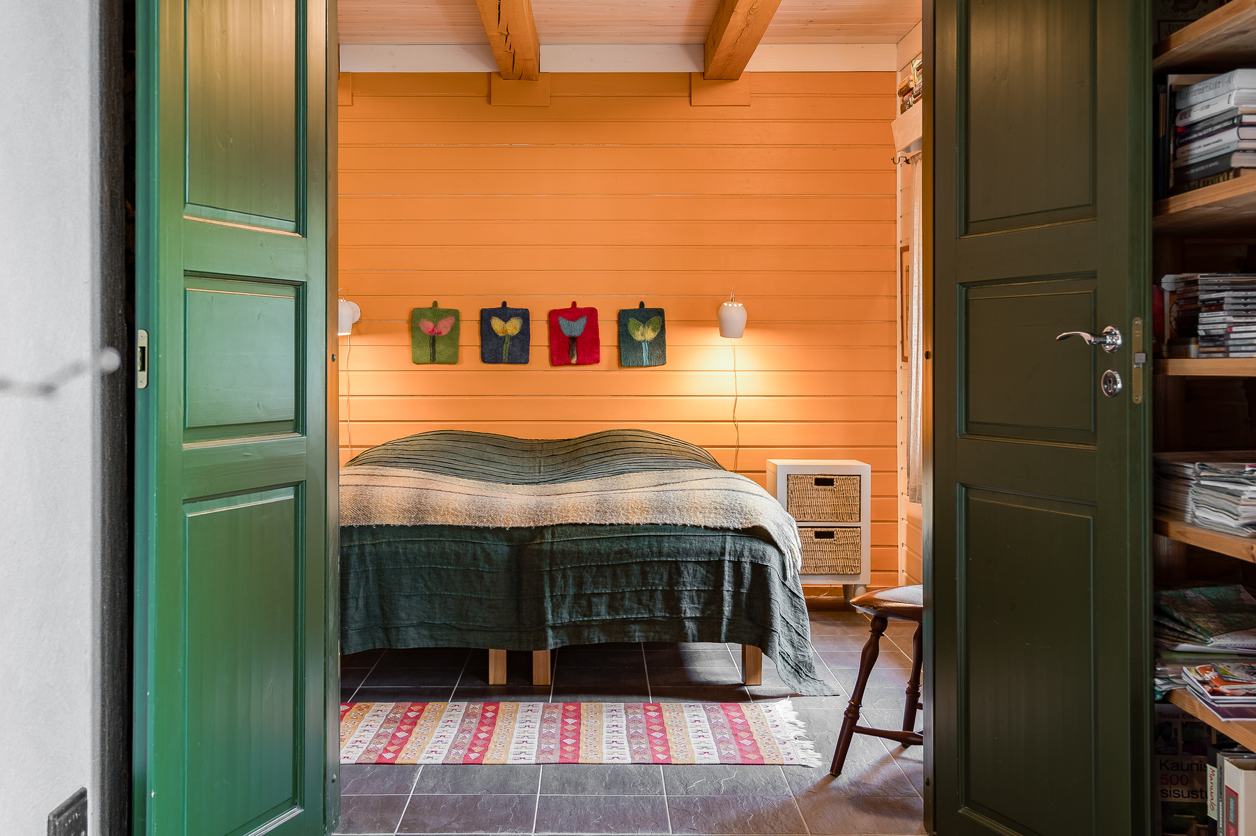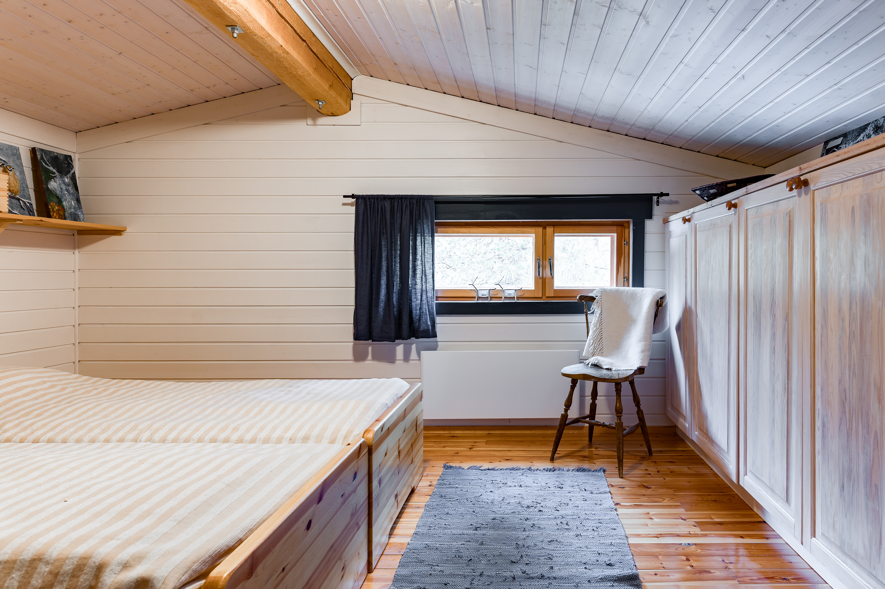 Toinen makuuhuoneista parvihuone, jonka pinta-alaa ei ole otettu huomioon neliöissä. Makuuhuoneissa kaapistot.