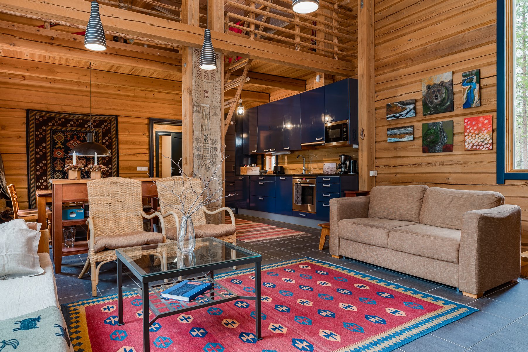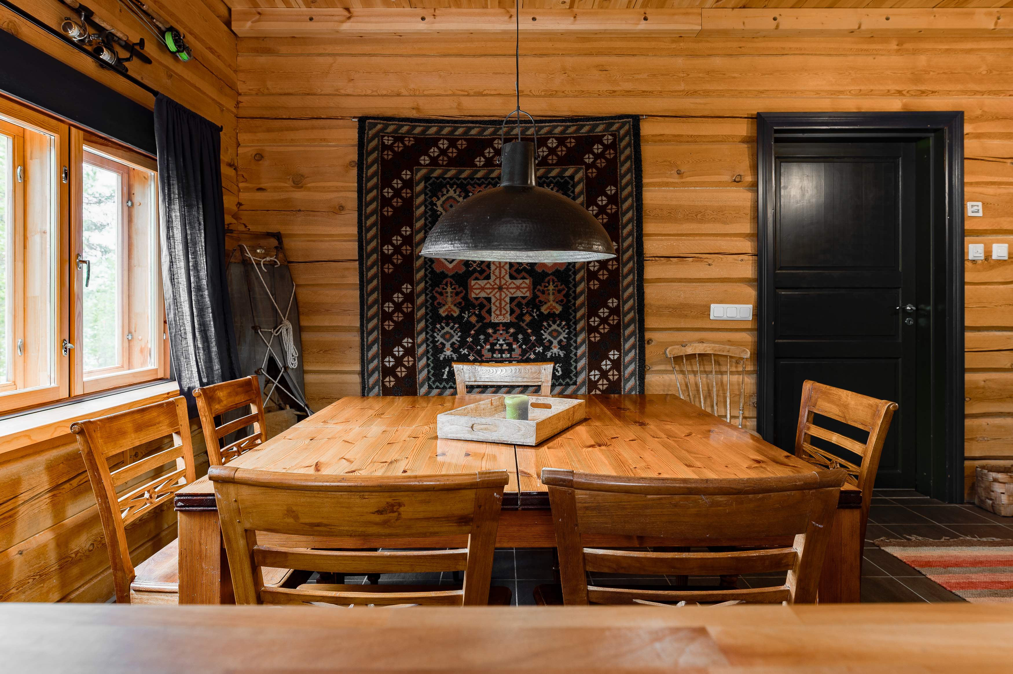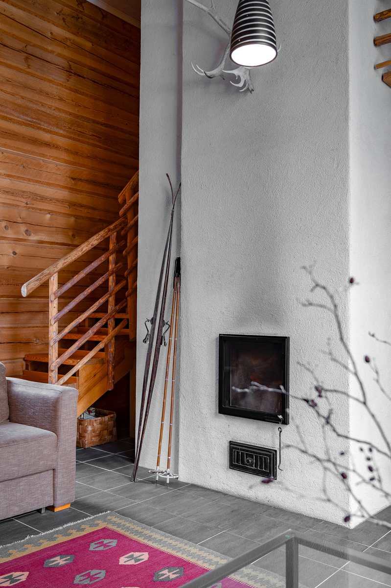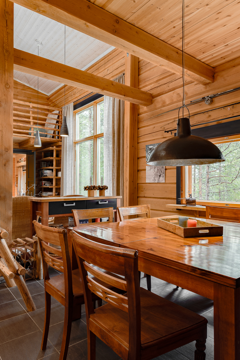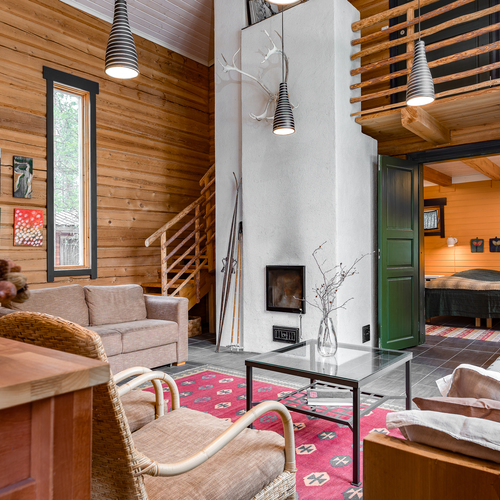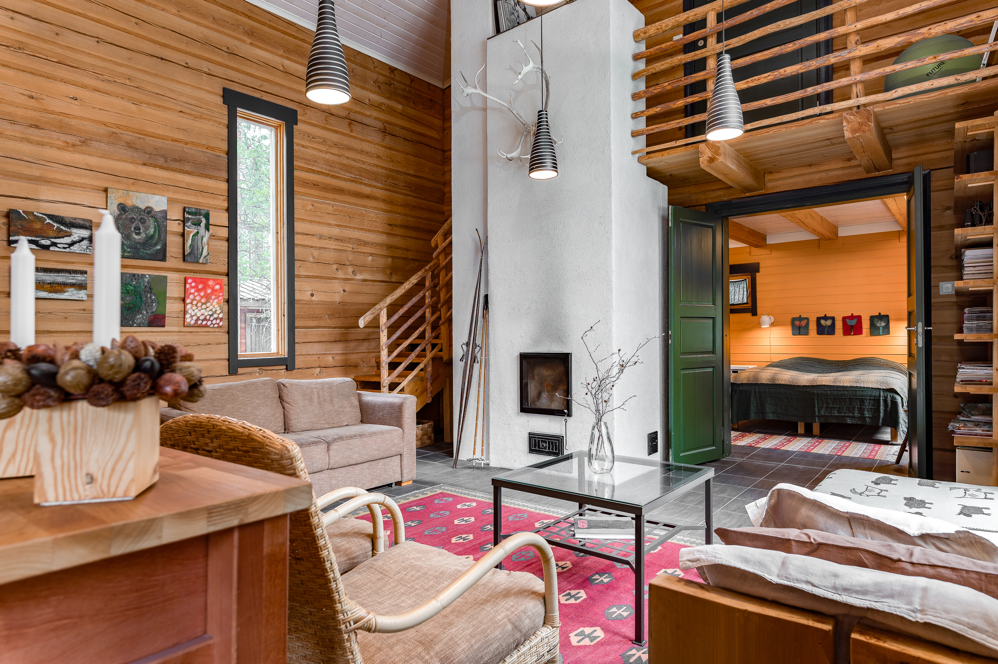 Lämminhenkinen sisustus, suurten ikkunoiden tuoma valoisuus ja avarat tilaratkaisut luovat harmonisen ja tunnelmallisen kokonaisuuden, joka hivelee esteettistä silmää.