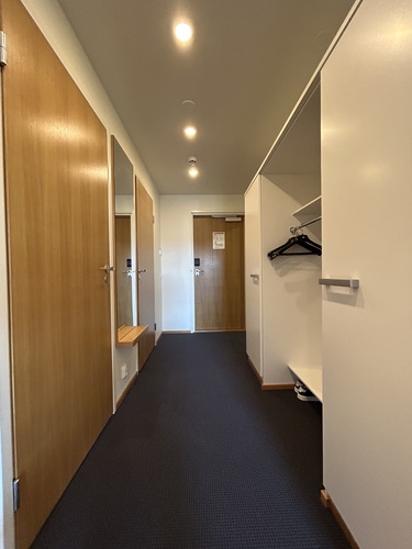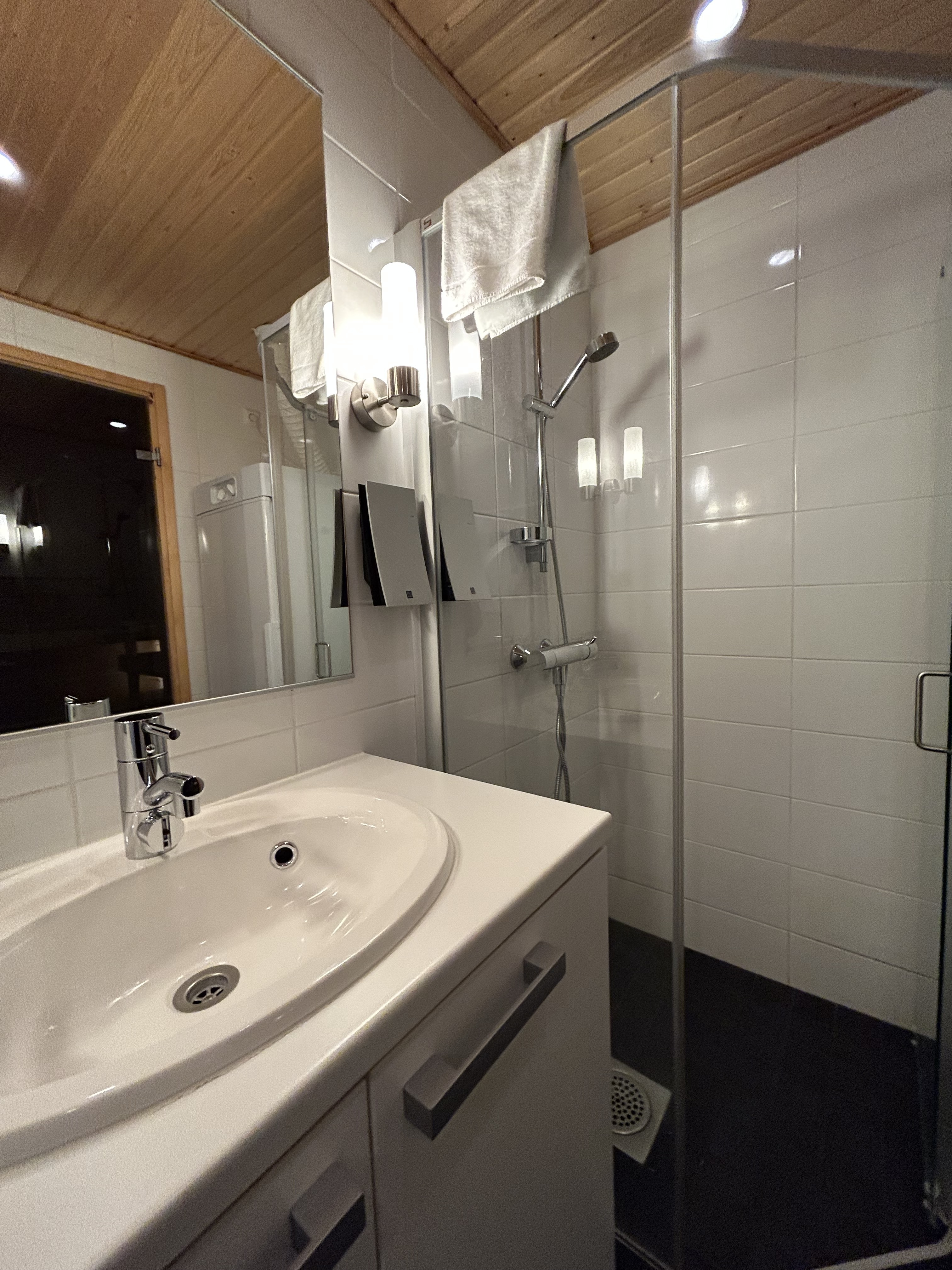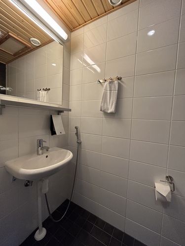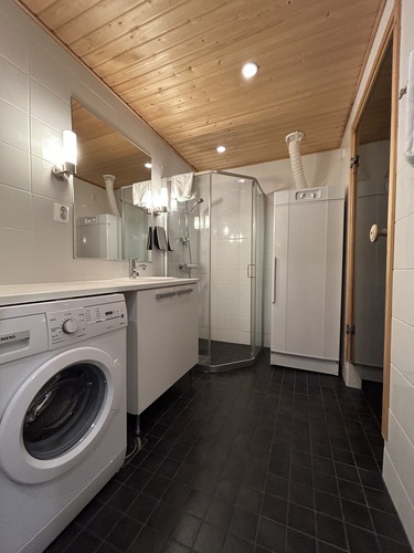 Varusteet: suihkukaappi, pesukone, kuivauskaappi, suihku, peili, kiinteät valaisimet, kylpyhuonekaapisto