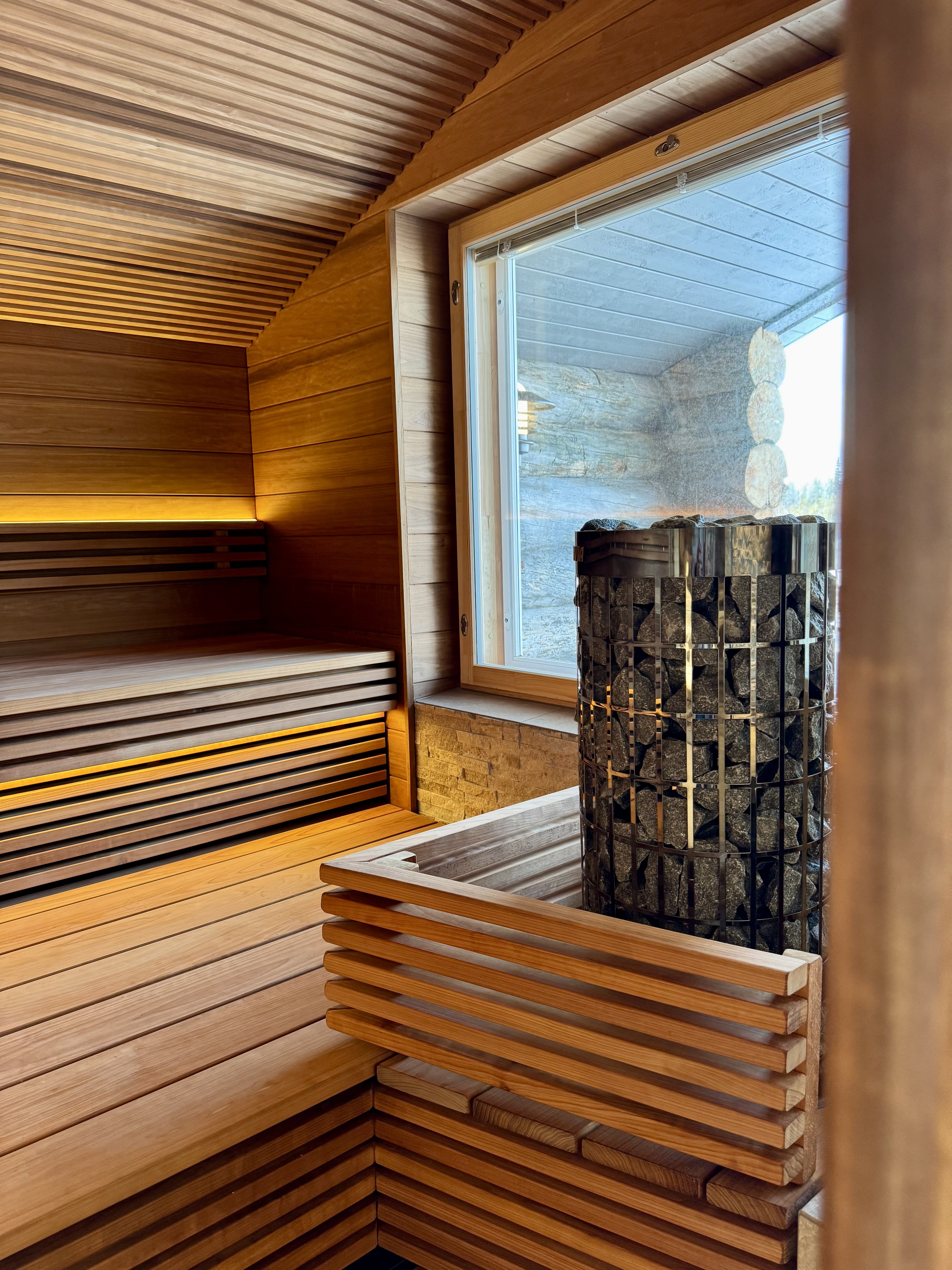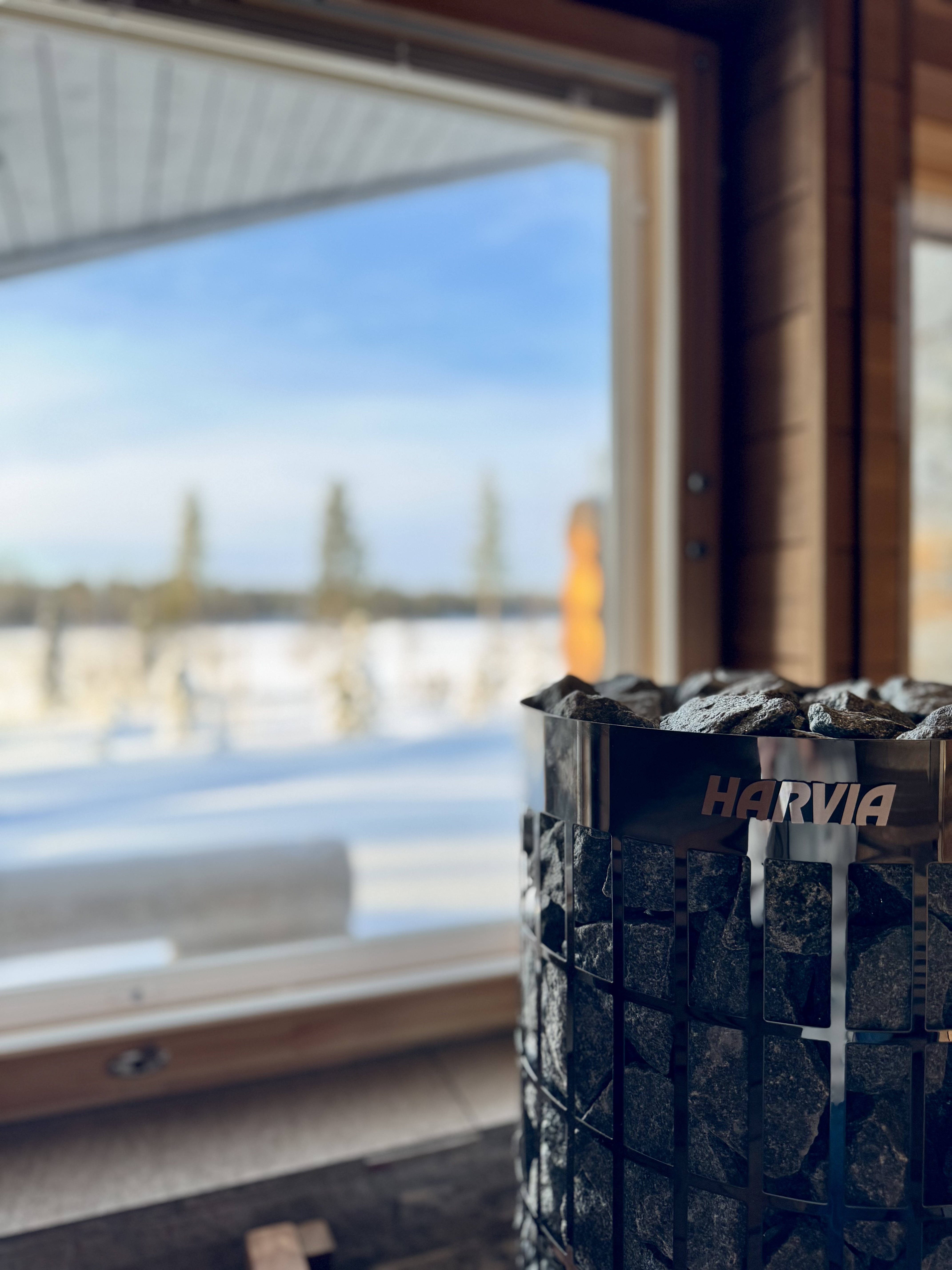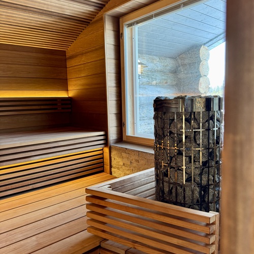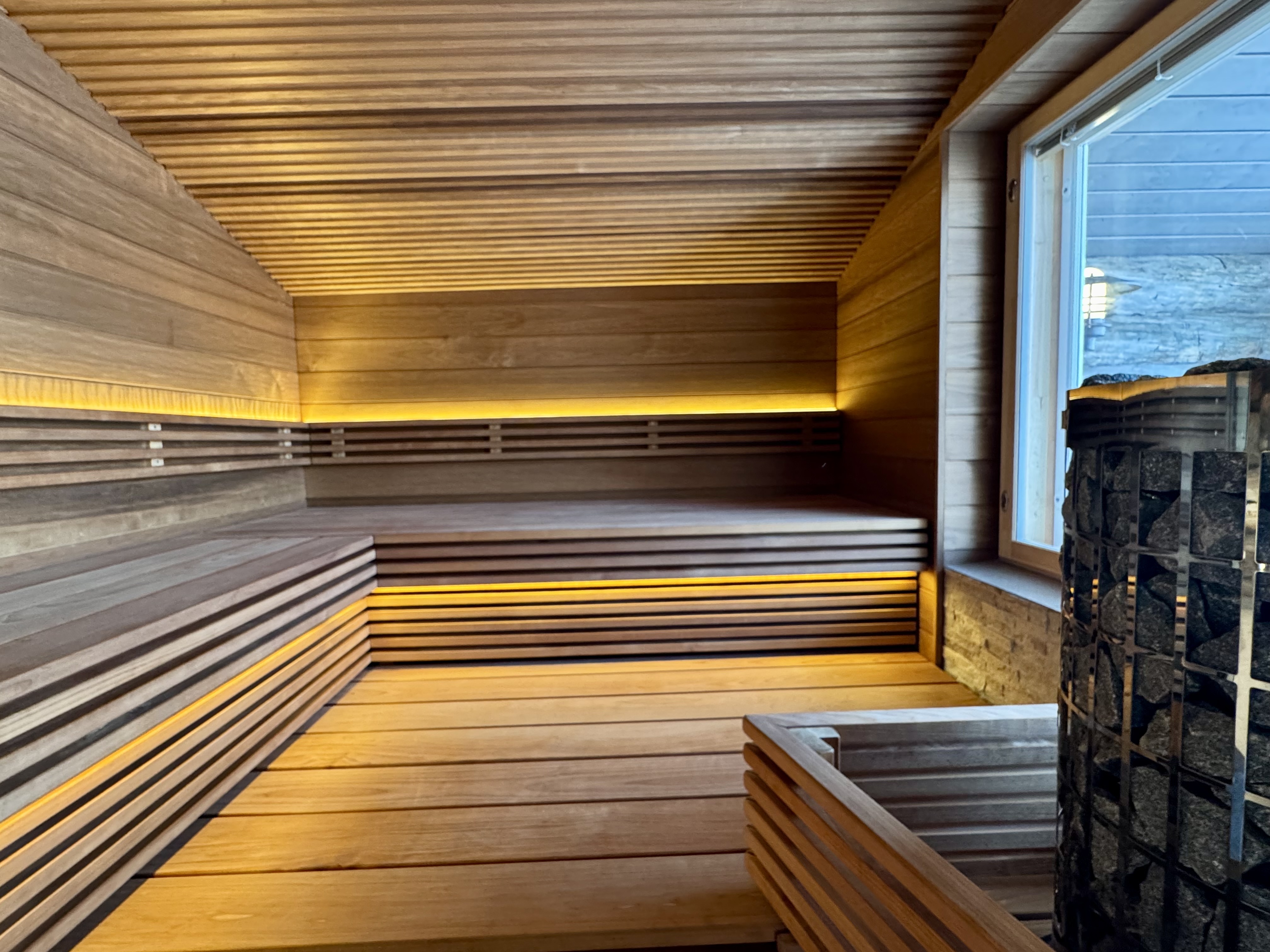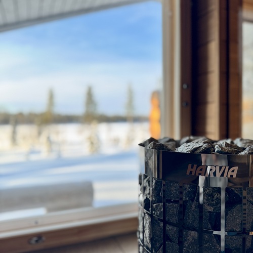 SähkökiuasHarvian pilarikiuas, iso ikkuna järvinäkymillä sekä lasiseinä. Lauteet lämpökäsiteltyä haapaa, seinät paneli sekä kiviverhoilu (Shanghai Kultapiisku). Rimakatto thermohaapaa. Saunasta kulku vilvoitteluterassille. Saunan yhteydessä saunabaari (minijääkaappi).
