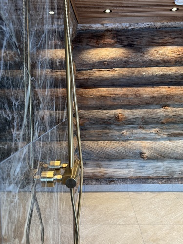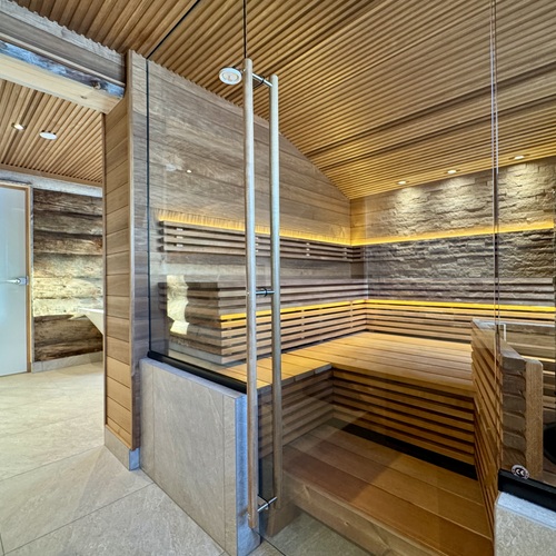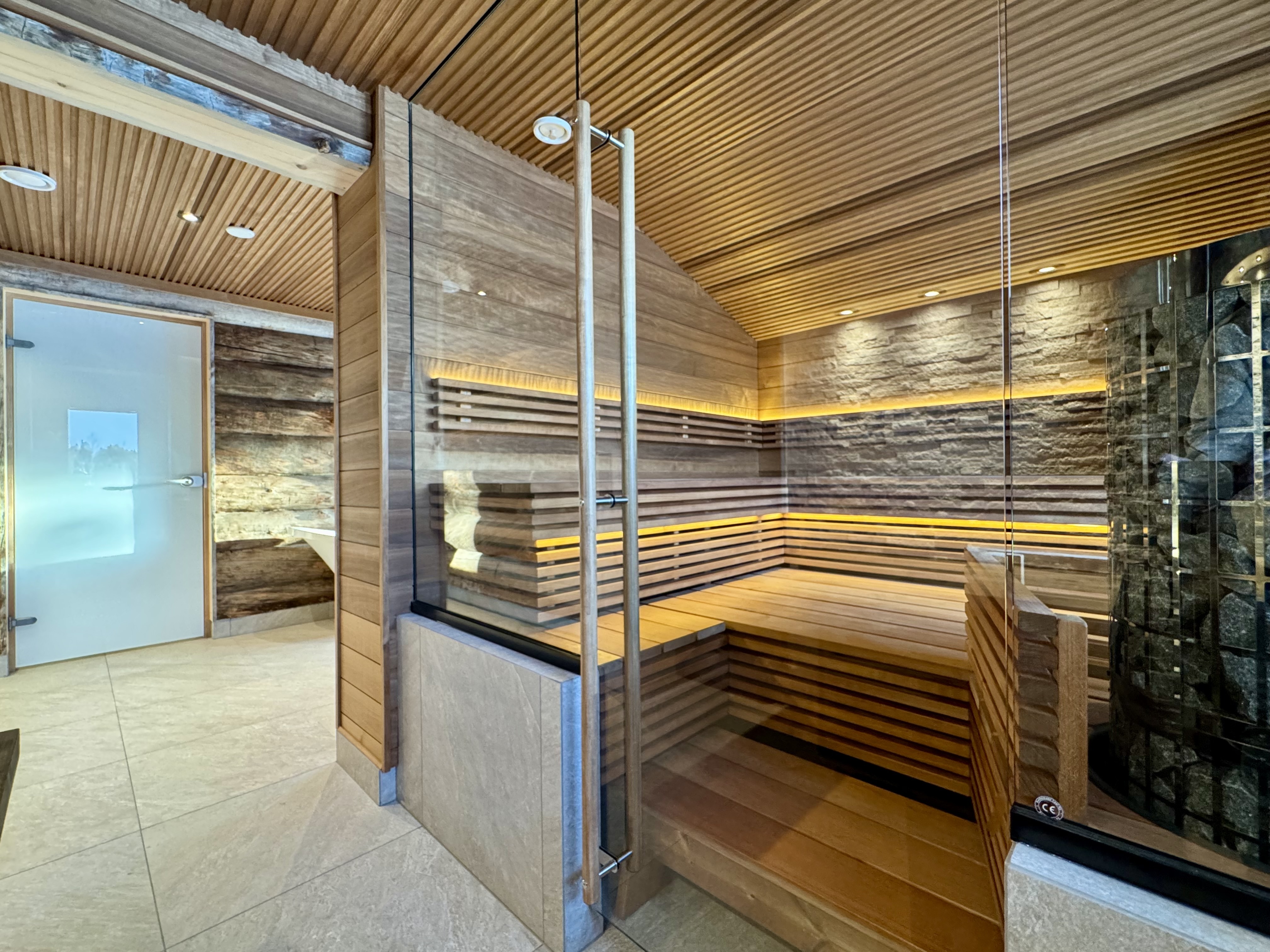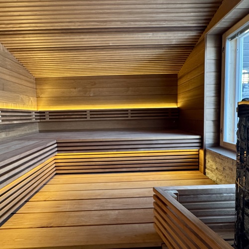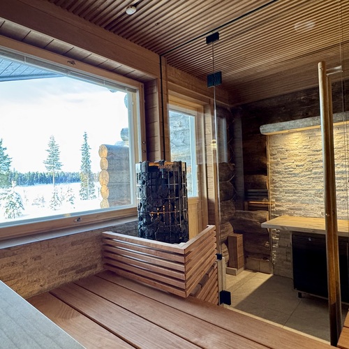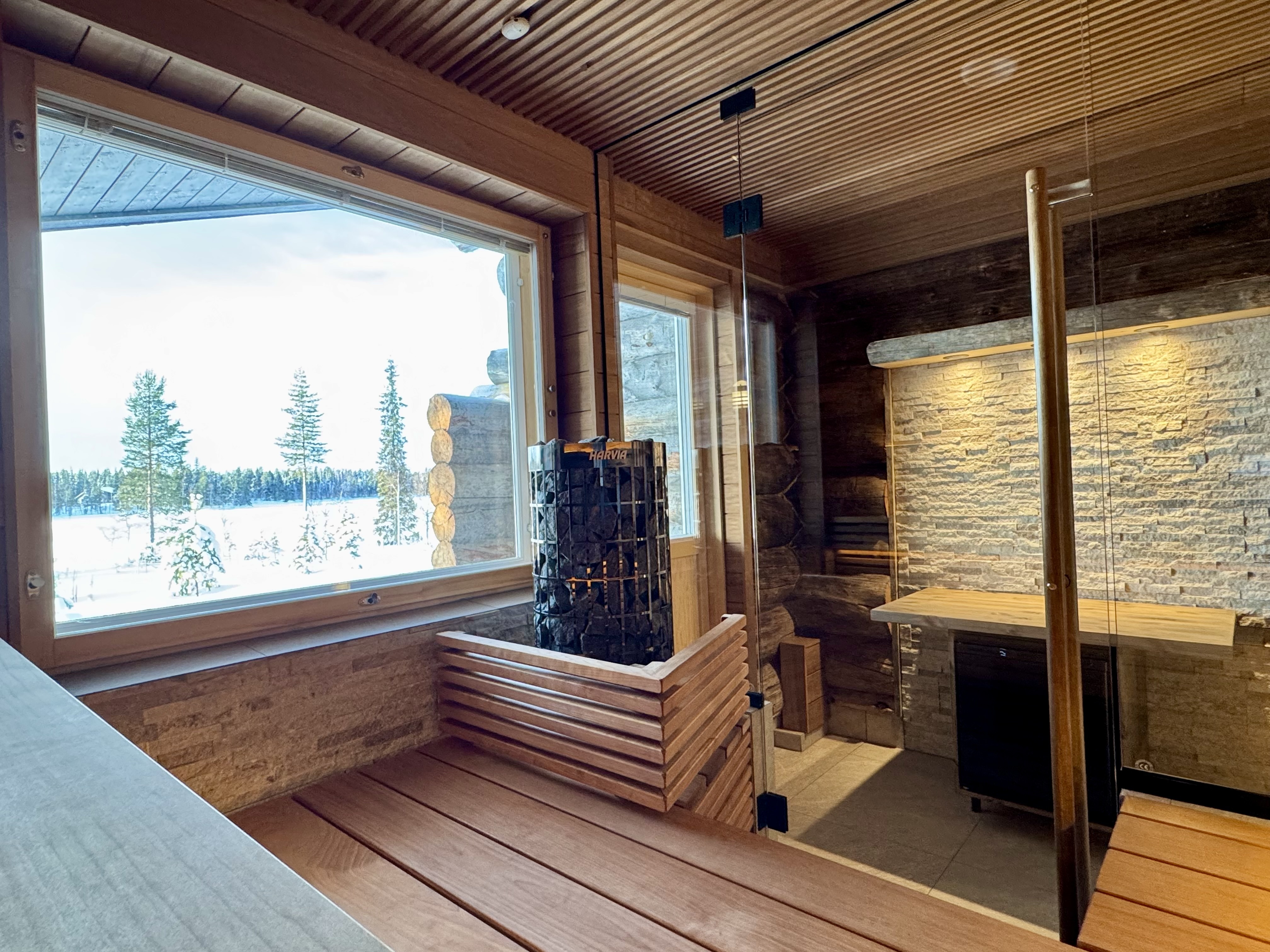 SähkökiuasHarvian pilarikiuas, iso ikkuna järvinäkymillä sekä lasiseinä. Lauteet lämpökäsiteltyä haapaa, seinät paneli sekä kiviverhoilu (Shanghai Kultapiisku). Rimakatto thermohaapaa. Saunasta kulku vilvoitteluterassille. Saunan yhteydessä saunabaari (minijääkaappi).