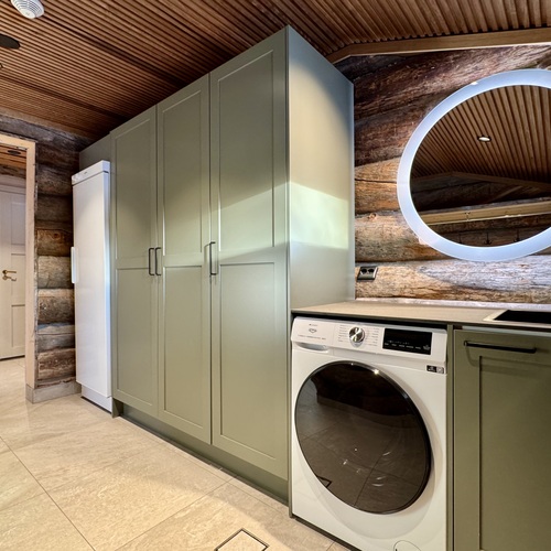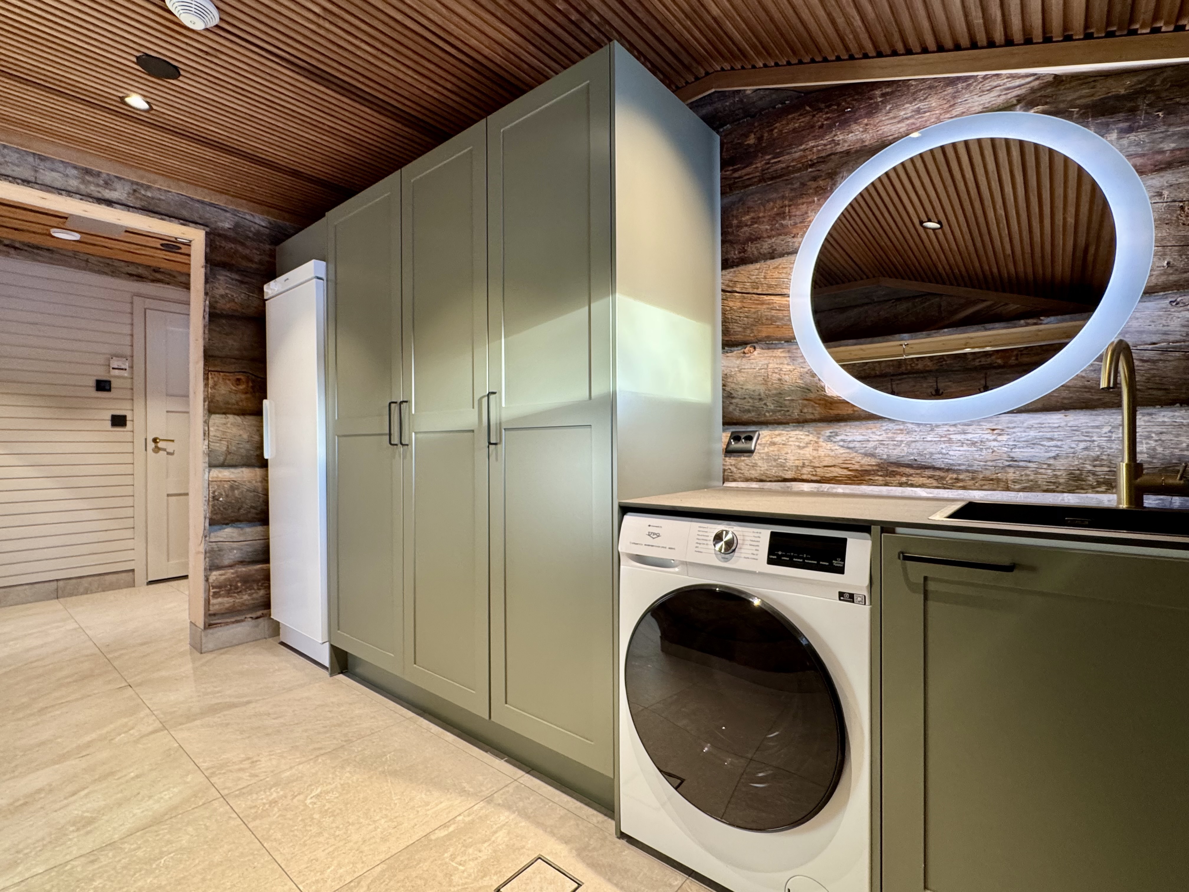 Varusteet: pesukone, kuivauskaappi, pesuallas, lattialämmitys, pyykkikaapit, pöytätaso