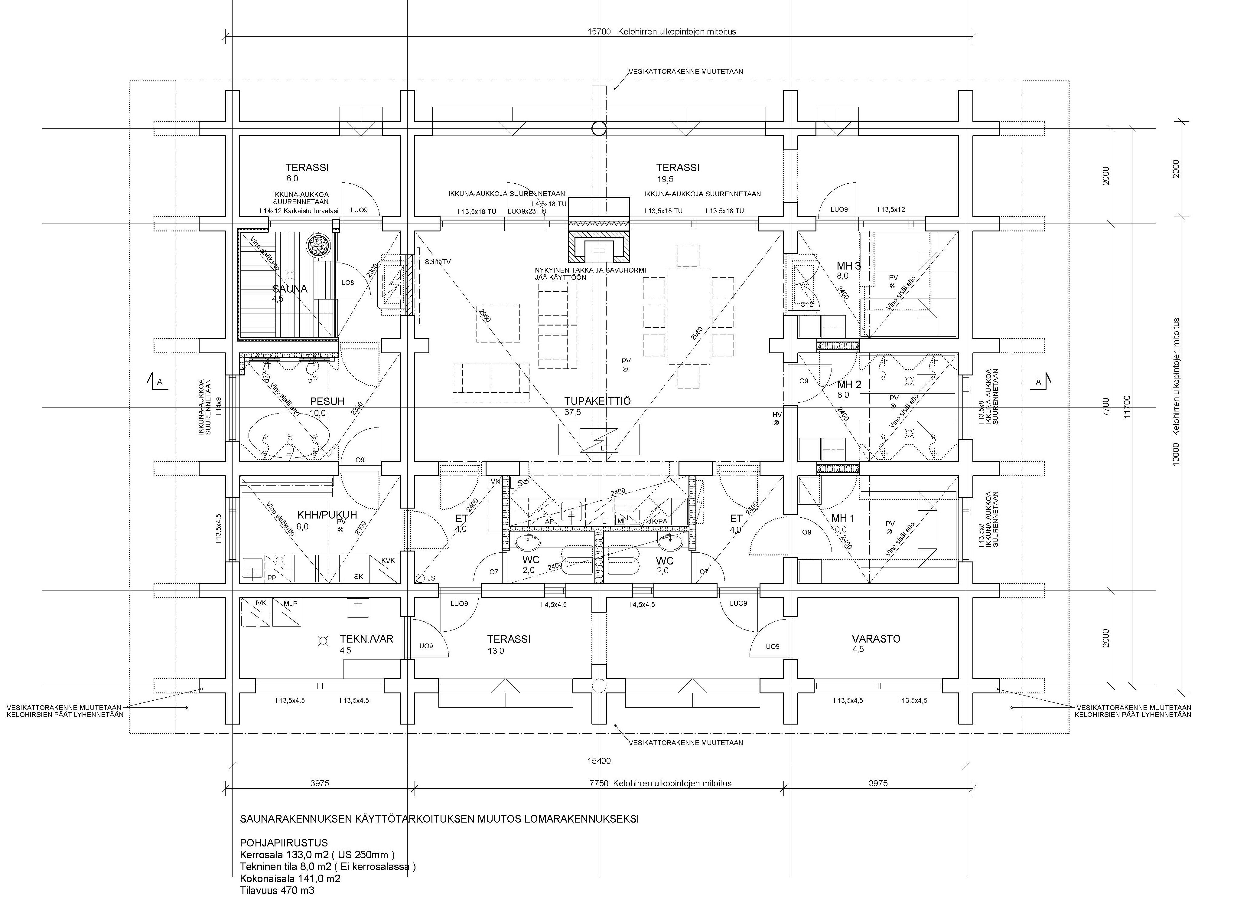 - vesikatto uusittu, yläpohja täysin purettu ja uusittu, vain tuvan sisäkattopaneelit jätetty