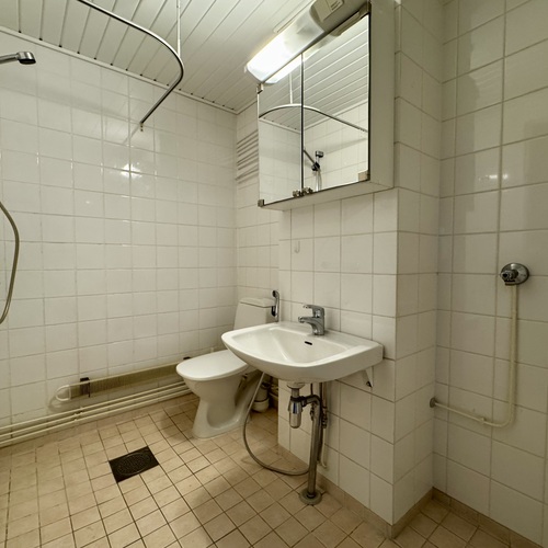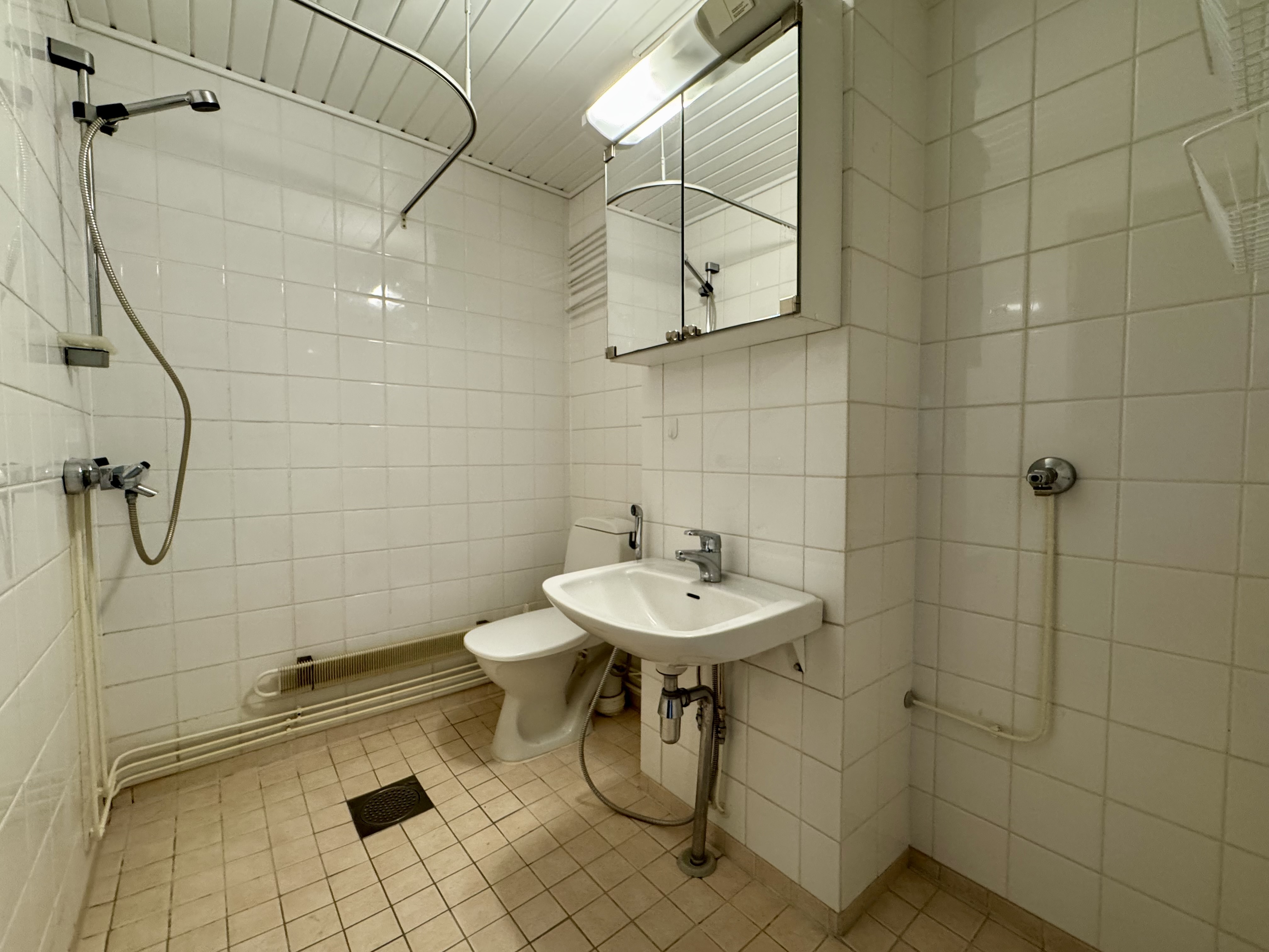 Varusteet: pesukoneliitäntä, wc-istuin, suihku, peilikaappi, kiinteät valaisimet