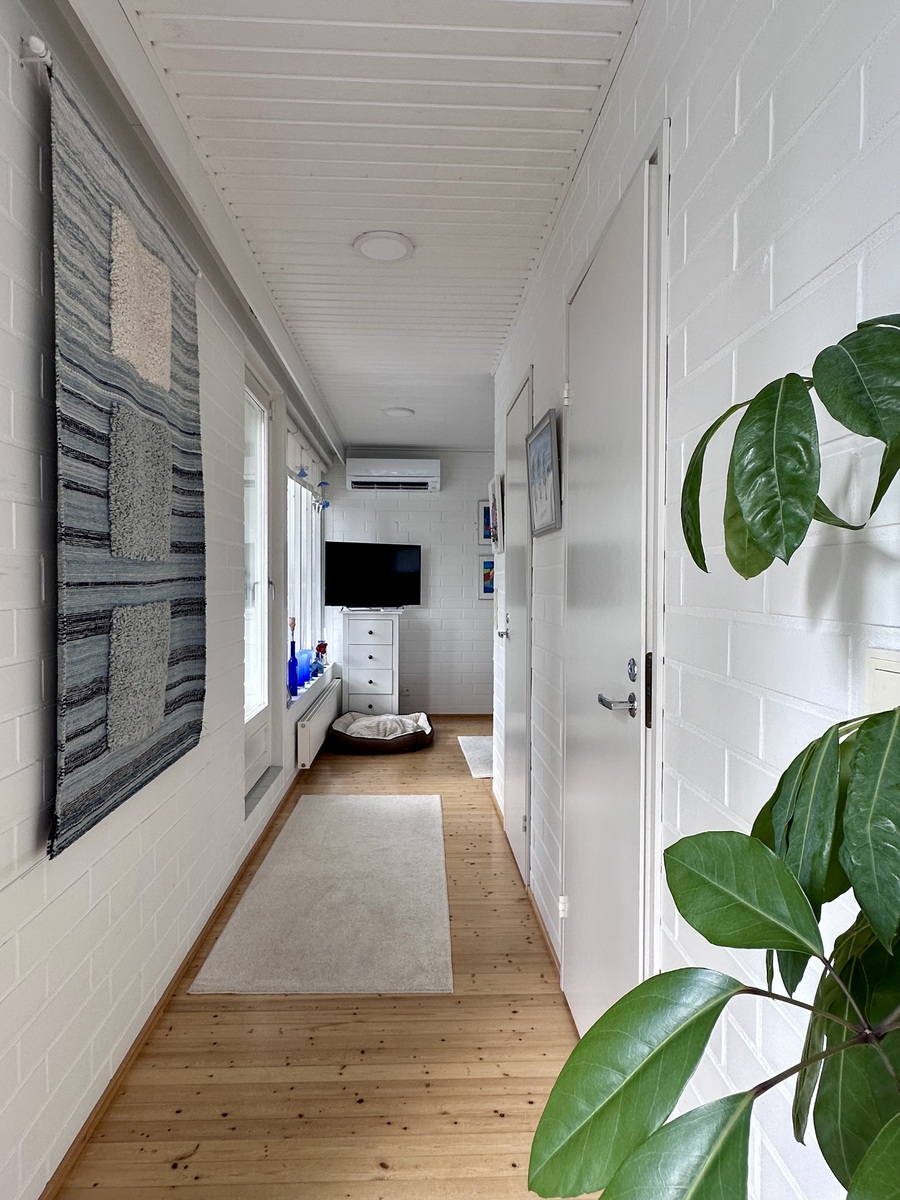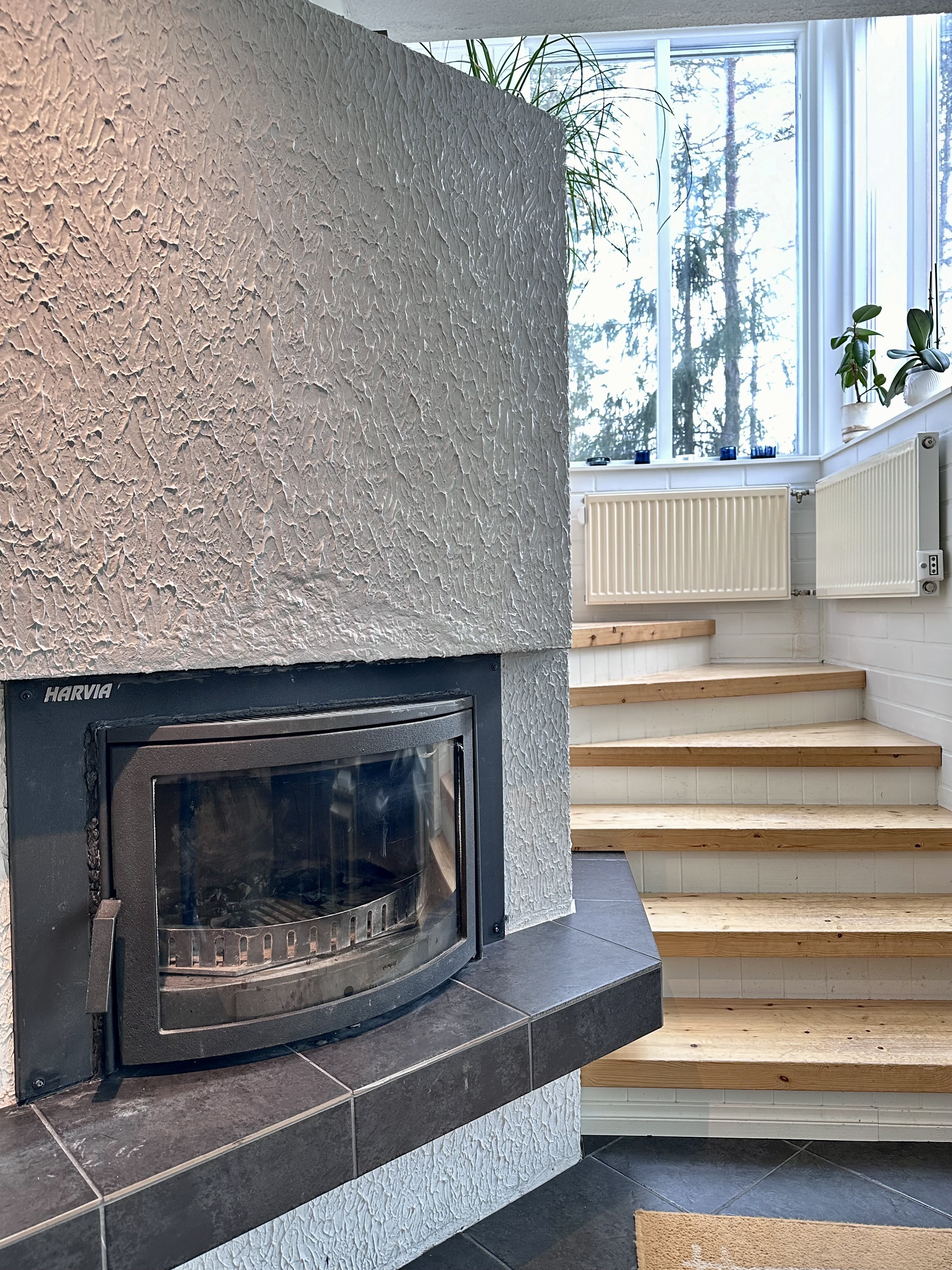 Asuntoa on remontoitu vuosien varrella mittavasti silti kunnioittaen talon henkeä. Minimalistinen arkkitehtuuri miellyttääkin silmää ja taipuu monenlaiseen sisustukseen. Samalla on jätetty elämään pala historiaa, josta tämän kodin hyvä tunnelma rakentuu.