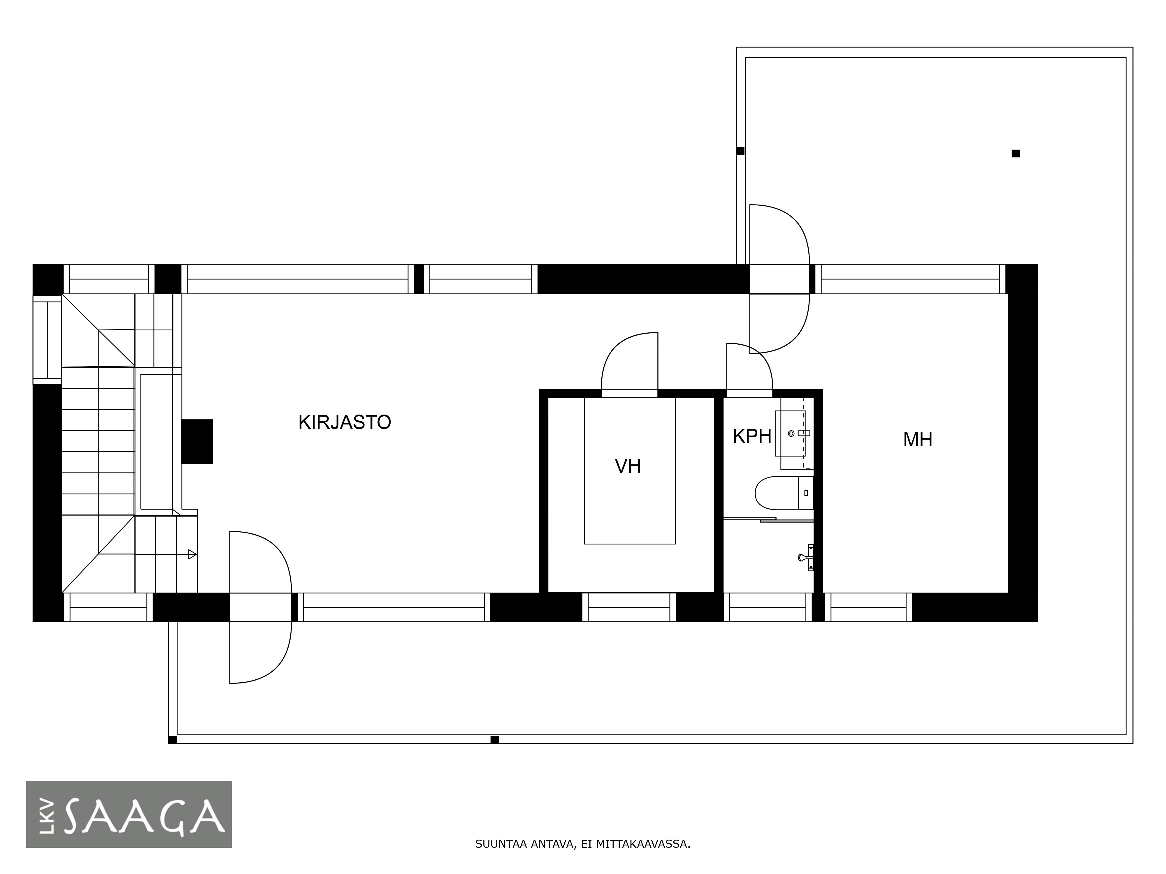 Yläkertaan kuljetaan valoisan portaikon kautta. Yläkerrassa on kirjasto, päämakuuhuone omalla kylpyhuoneella sekä iso vaatehuone. Myös yläkerrassa hulppeat terassitilat.
