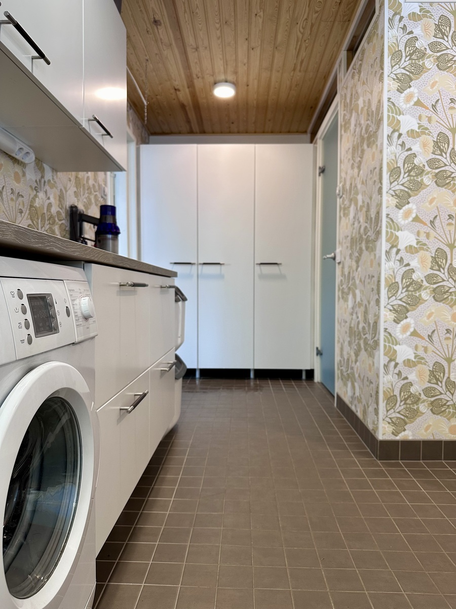 - takamakuuhuone vinyylilattia 2020, gyproc/tapetti/maali ja kaapit 2021