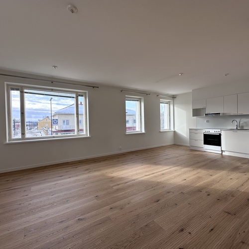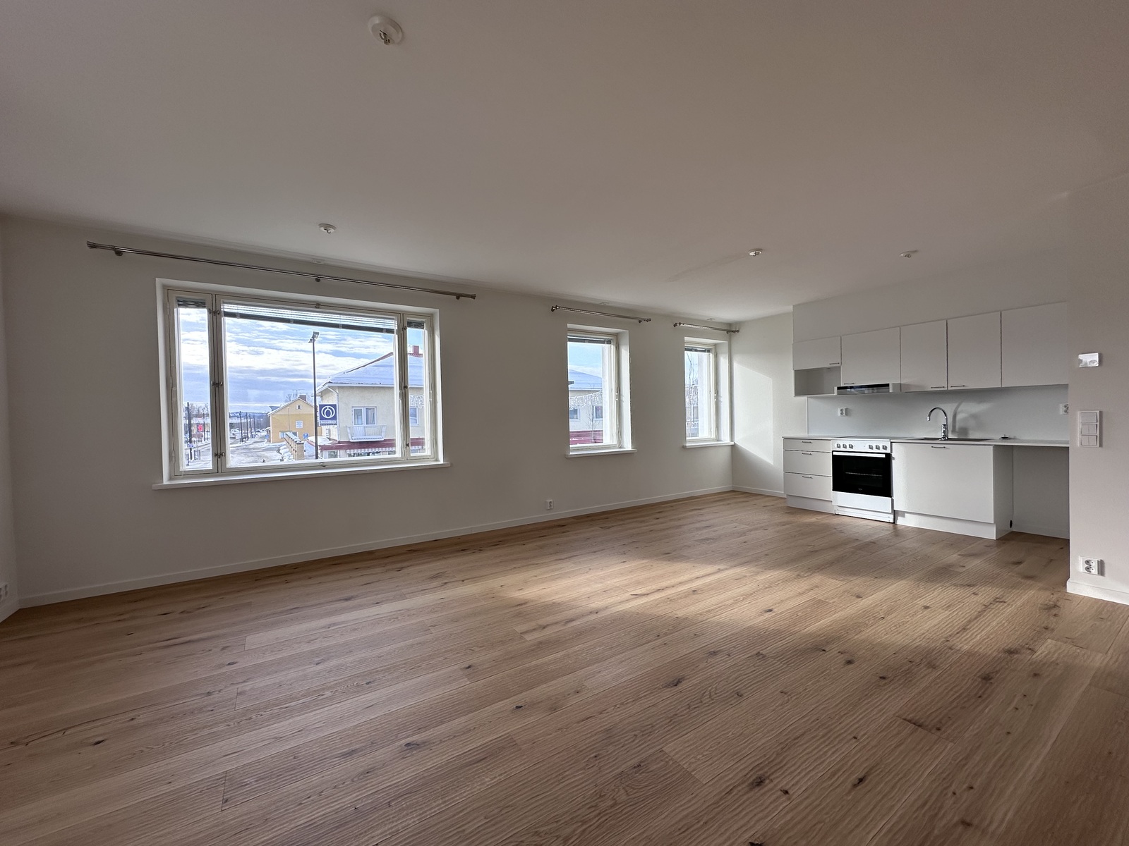 Asunnossa tilavat ja valoisat huoneet. Olohuoneen ikkunoista näkymät Kuusamon ydinkeskustan uusittuun ja viihtyisään katukuvaan ja makuuhuoneiden ikkunat takapihalle päin.